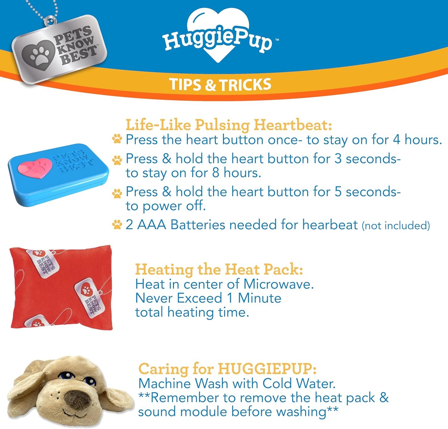 PETS KNOW BEST- HuggiePup is sure to catch your dog’s attention with the warmth and comfort it provides and become their favorite toy in no time! They will love cuddling, sleeping, and loving this toy. INCLUDES 1 Golden HuggiePup, 1 reusable heat pack, 1 life-like heartbeat