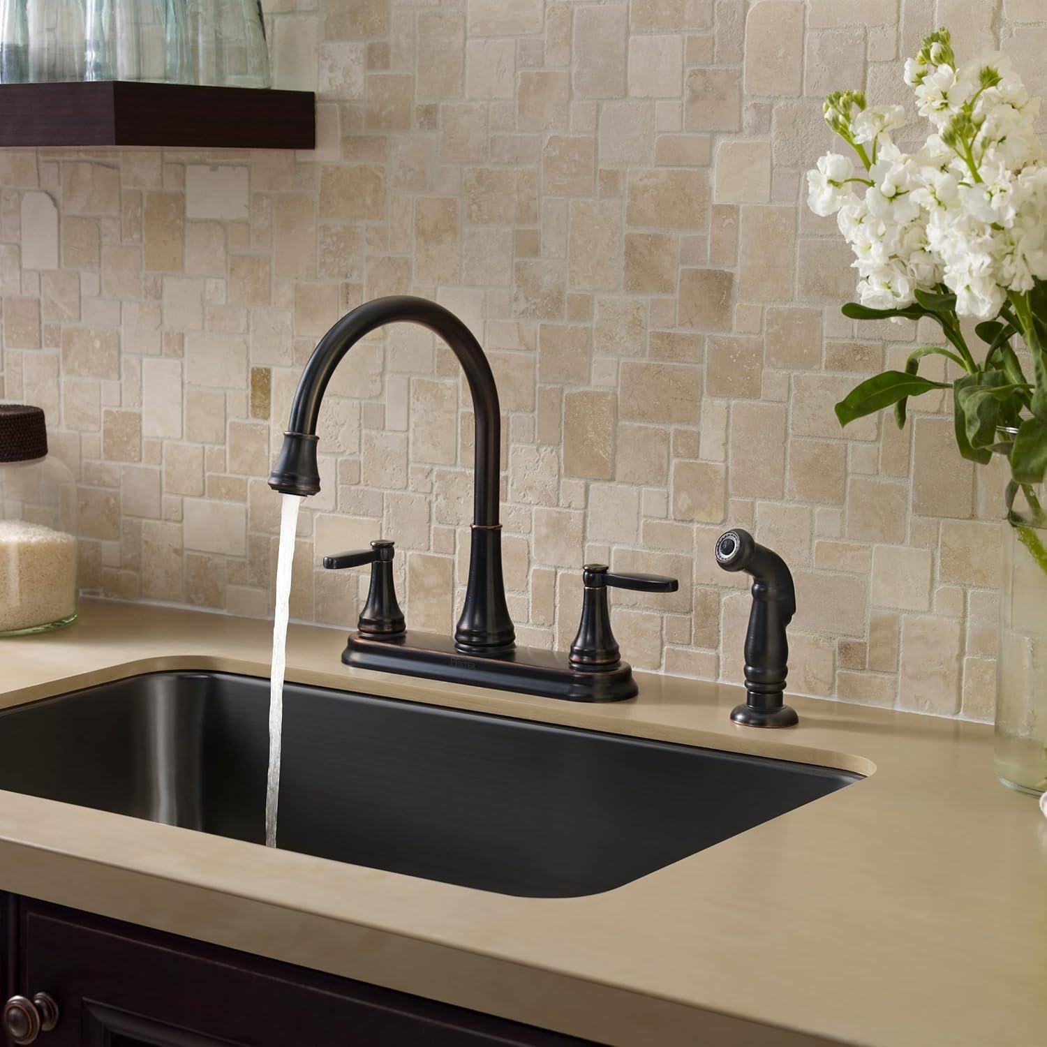 KITCHEN FAUCET WITH SIDE SPRAYER – Spout swivels 360 degrees for maximum maneuverability; high arc spout for added clearance and reach; coordinating, decorative side spray