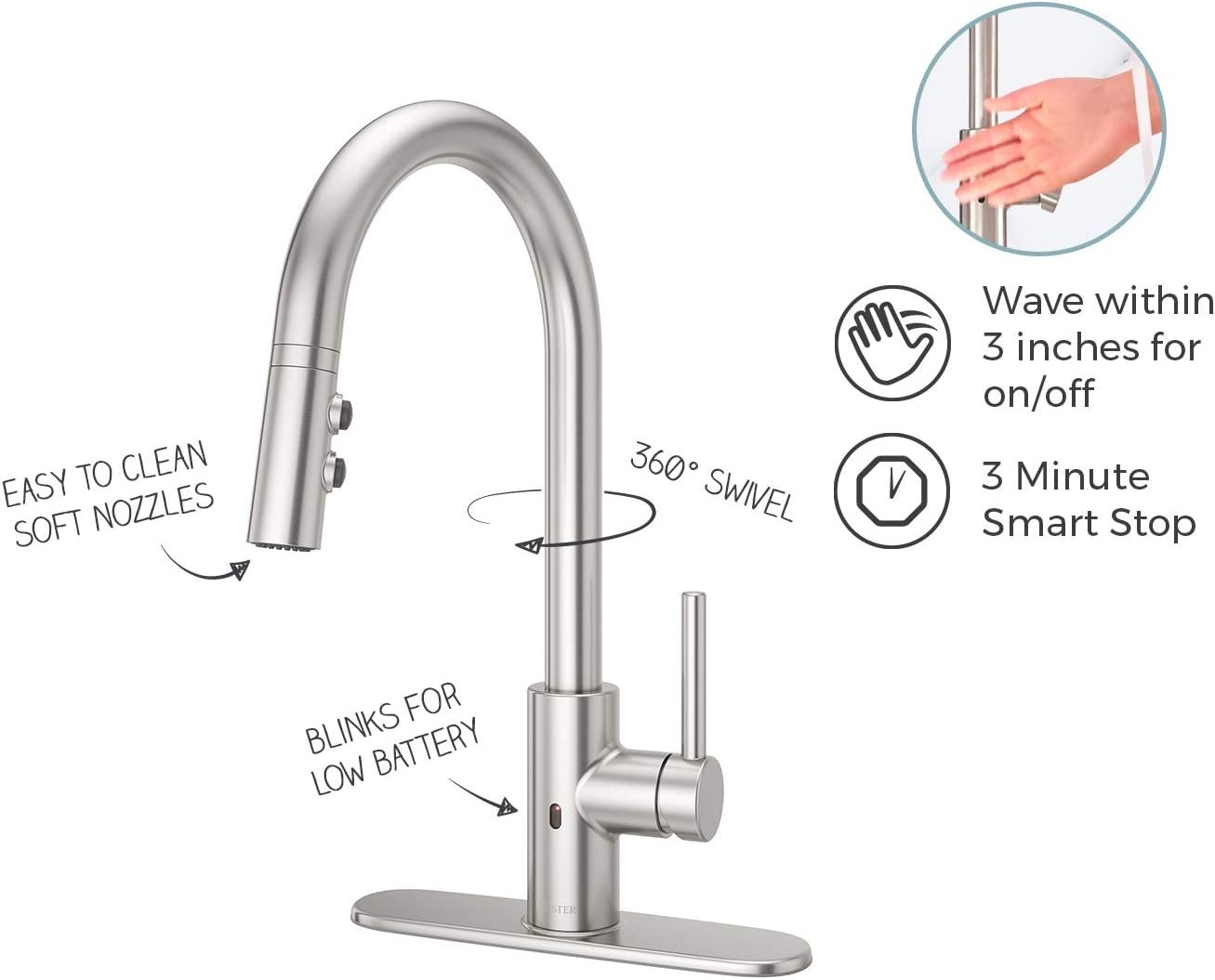 React touch free technology – hands free faucet allows you to turn the water on and off within 3” of the motion sensor; SmartStop – automatically shuts off the faucet after 3 minutes of inactivity; For use in manual mode, leave handle pushed in or use manual override switch