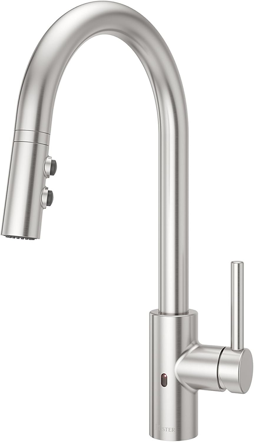 The Stellen pull-down kitchen faucet collection combines sleek, simple lines and contemporary curves to create a modern faucet designed to meet today’s demand for popular urban and euro designs. On this electronic touchless model, React touch-free technology allows you to turn the water on and off within 3” of the motion sensor. SmartStop automatically shuts off the faucet after 3 minutes of inactivity. For use in manual mode, leave handle pushed in or use manual override switch. The forward only faucet handle is compatible with close backsplashes while the pull-down spray head allows three water settings: spray, stream, and pause. No need to hold down the button to keep in the desired setting (except pause). Included is an optional deck plate for sinks with 3 faucet holes. Plug-in power supply also included. A battery pack also available to purchase separately, #952-007, in case you don’t have an outlet under your sink. The Stellen collection also includes both a full size non-electronic kitchen faucet and a smaller bar/prep faucet size to fit every kitchen space perfectly or even serve as a laundry faucet. Crafted for performance and inspired by modern loft living, Stellen is available in three finishes: Polished Chrome, Stainless Steel, Matte Black, and (for non-electronic, full-size only) Brushed Gold, all of which are covered under the Pfister limited lifetime . Care and Cleaning In most cases, a soft damp cloth will keep your faucets and accessories looking like new for years to come. Lightly soak the cloth with warm, soapy water and clean faucet surfaces regularly. Avoid using polish, detergents, abrasive cleaners, organic solvents or any product that has acid in it. This will nullify your and damage the finish. If you follow our care instructions and still have problems with the finish of your Pfister products, we have a Pforever that covers the finish (with proper care) and the function of your faucets and fixtures for as long as you own your home.