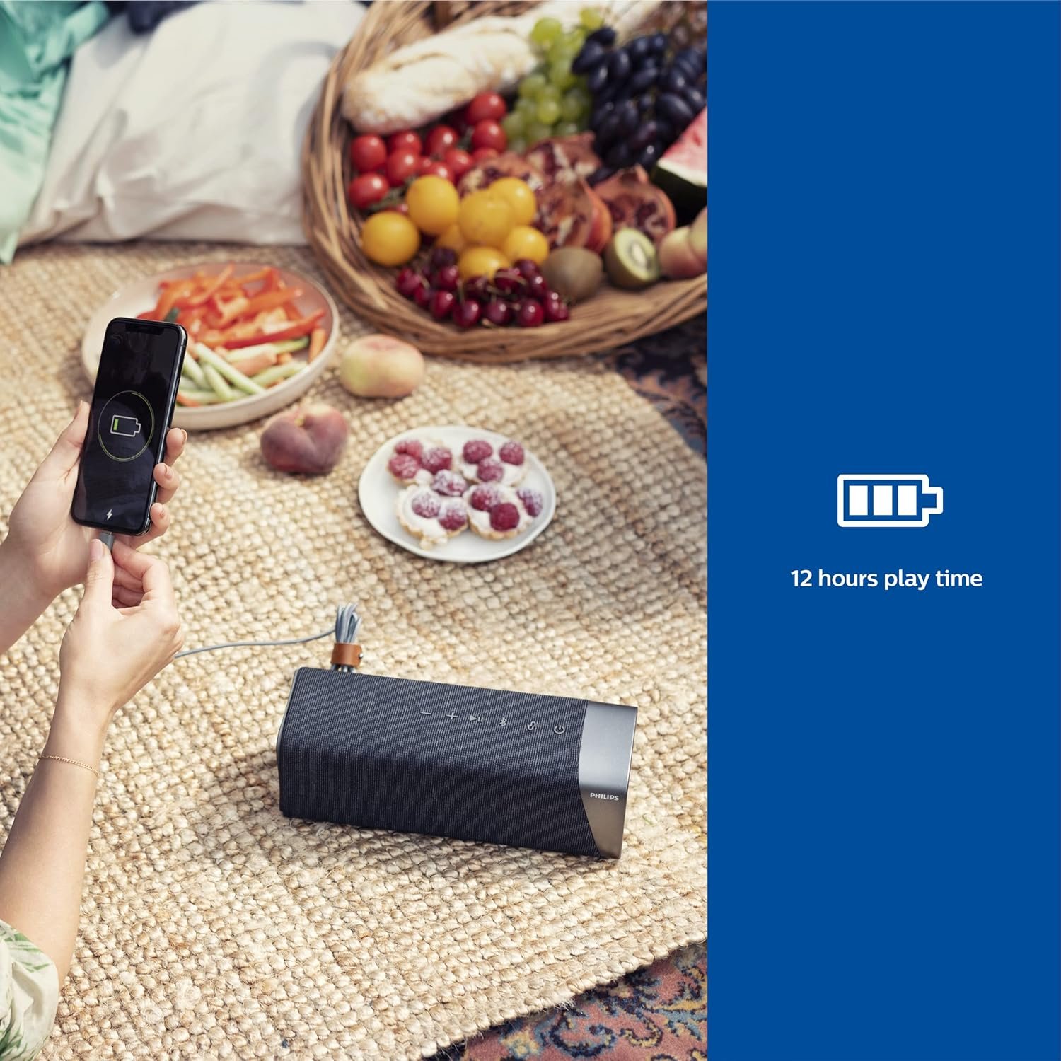 ANYTIME, ANYWHERE: Thanks to the long battery life, you can grab your speaker and go. A single charge offers 12 hours of playtime. Charging takes 3.5 hours via the included USB-C cable