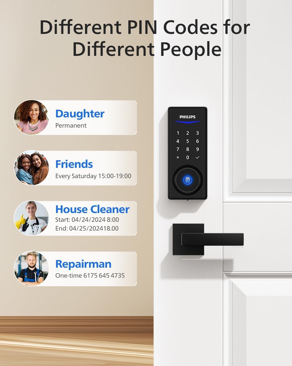 𝐕𝐚𝐫𝐢𝐨𝐮𝐬 𝐏𝐈𝐍 𝐜𝐨𝐝𝐞𝐬: Our keyless door locks come with a total of unlimited one-time PIN and 100 user PINs codes. Once a one-time PIN is used, it is automatically deleted and cannot be used again. If used with a Philips WiFi Gateway (sold separately), you can share your timed and recurring PINs with different people.