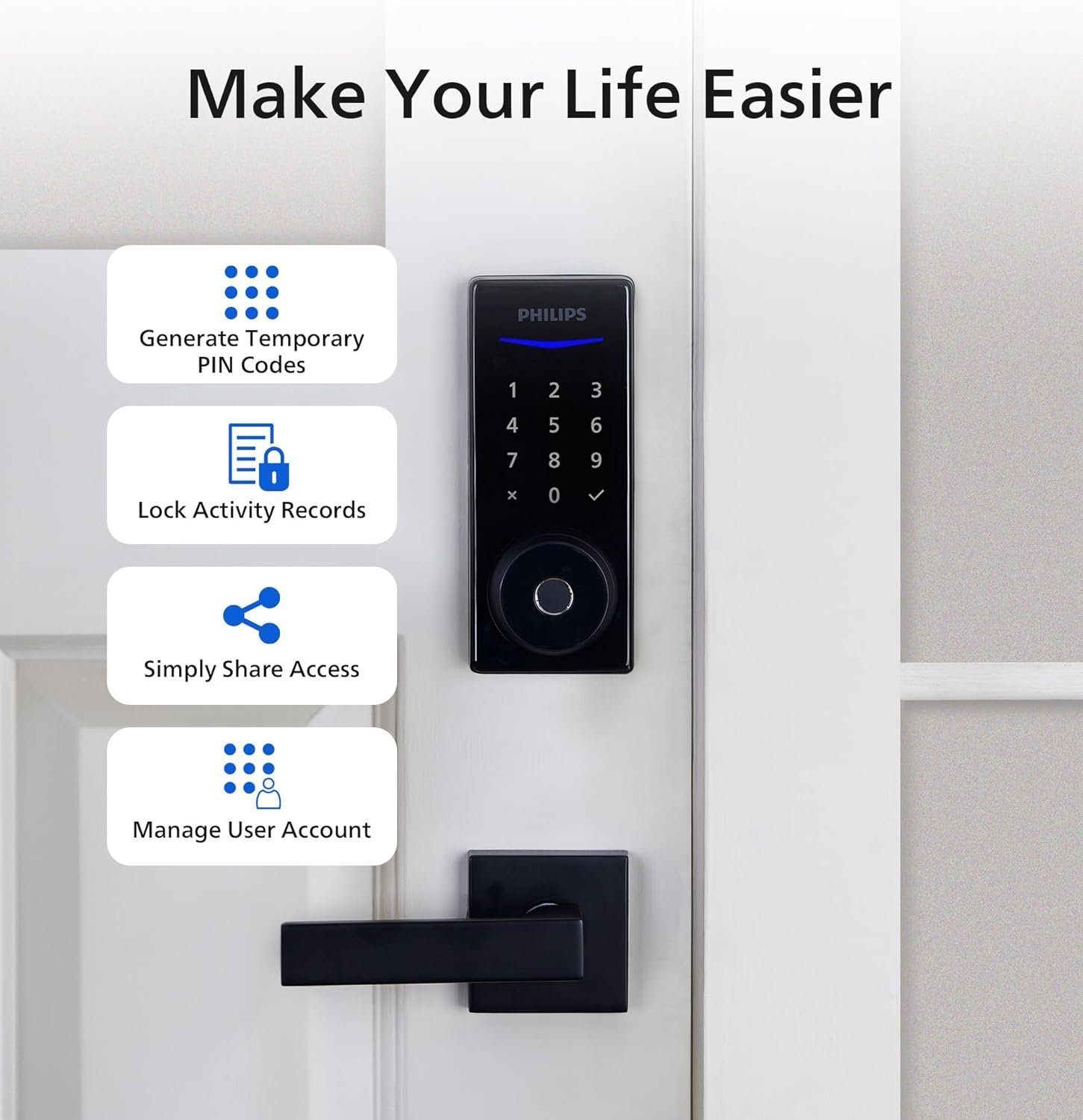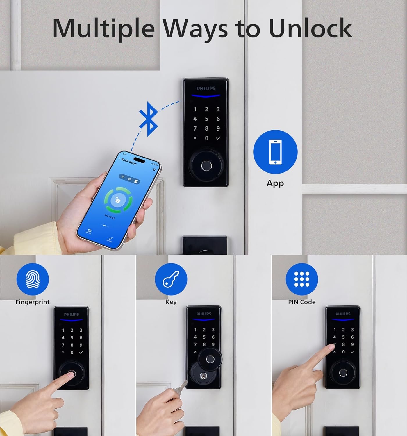 𝐒𝐦𝐚𝐫𝐭 𝐁𝐥𝐮𝐞𝐭𝐨𝐨𝐭𝐡 𝐋𝐨𝐜𝐤: Build-in Bluetooth allows convenient access via smart phone. If used with a Philips WiFi gateway (sold separately), you can remotely control the opening and closing of the lock, share permissions, and view unlocking records.