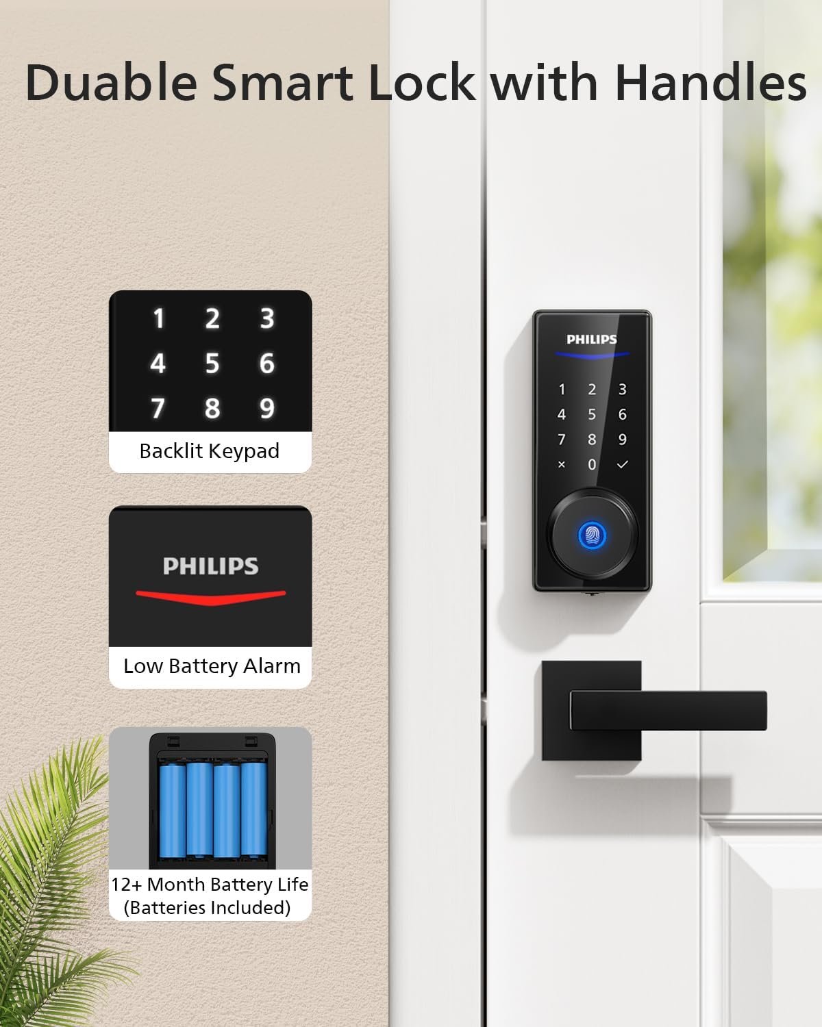 𝐒𝐦𝐚𝐫𝐭 𝐃𝐨𝐨𝐫 𝐋𝐨𝐜𝐤 𝐇𝐚𝐧𝐝𝐥𝐞 𝐒𝐞𝐭: The package includes 2 lever handles and Philips lock, allowing you to easily upgrade your existing door lock as well as your handles. Our Philips smart door lock keeps your home safe and gives you and your family peace of mind.