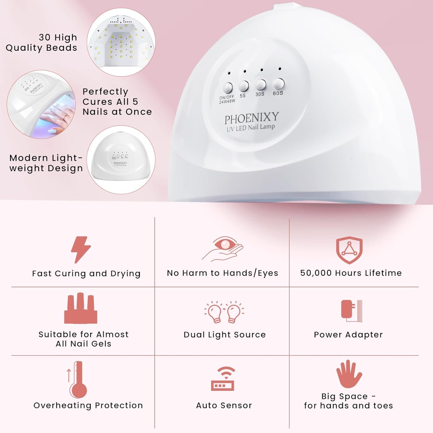 【48W U V/LED Nail Lamp】The U V LED 48W nail lamp comes with 30 lamp beads, 3 curing modes: 5s/30s/60s, which can quickly cure all kinds of gel and save most of the time for nail art. Intelligent U V nail lamp: hand in, light on; hand out light off.