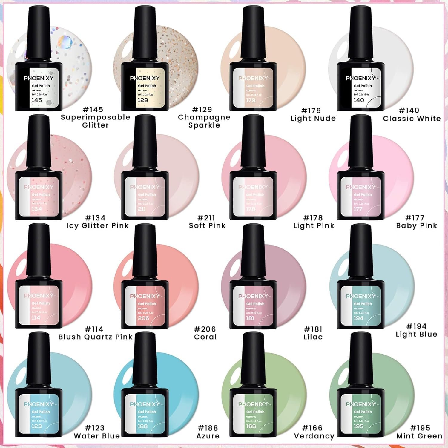 【What’s in Gel Nail Polish Set】The Phoenixy gel nail polish kit with U V light includes 16*8ml nail gel polish, 4*8ml glossy matte glitter top and base coats, 48W U V nail light, and other basic manicure tools. The Gel Nail Polish Set with U V light has all nail tools you need to do a manicure without having to buy anything else extra.