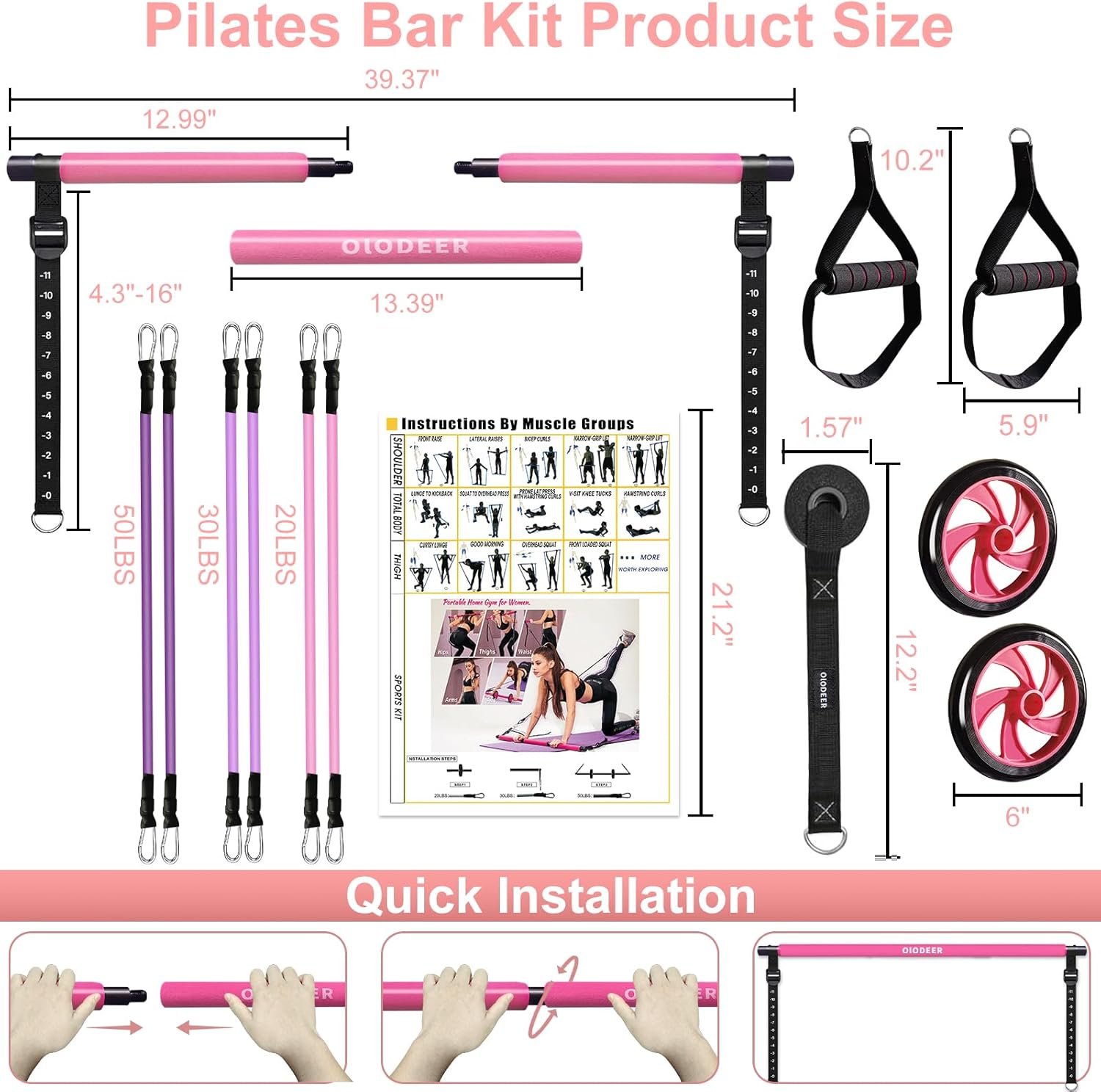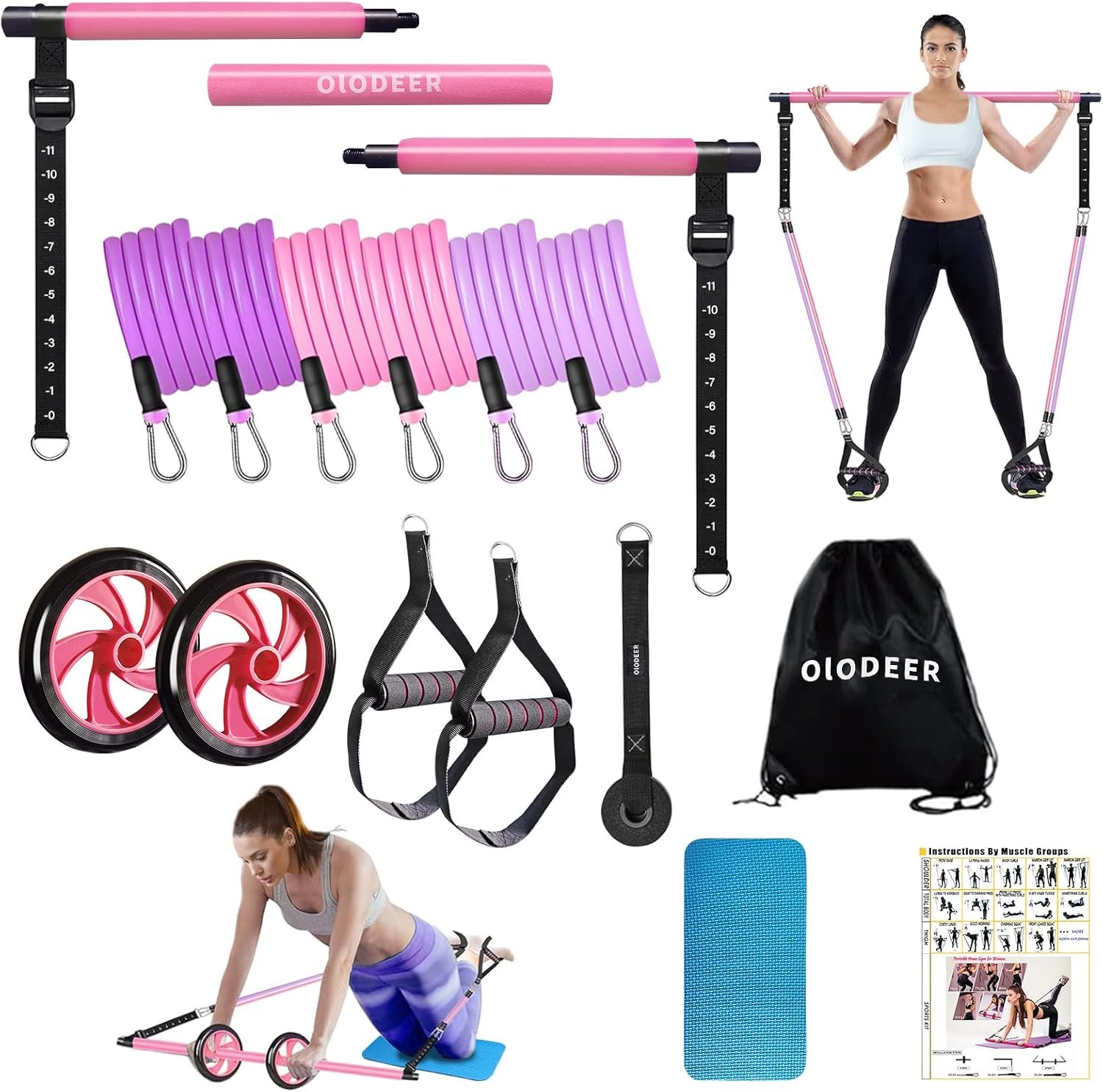 【OLODEER Pilates Bar Kit】Our portable pilates bar kit includes 3 sections of high quality steel pipes, 6 resistance bands, 2 abdominal wheels, 2 handles, 1 door anchor, 1 portable bag, 1 training guide, 1 mini mat, If you have any questions about quality or use method, please contact us promptly and we will get back to you within 24 hours.