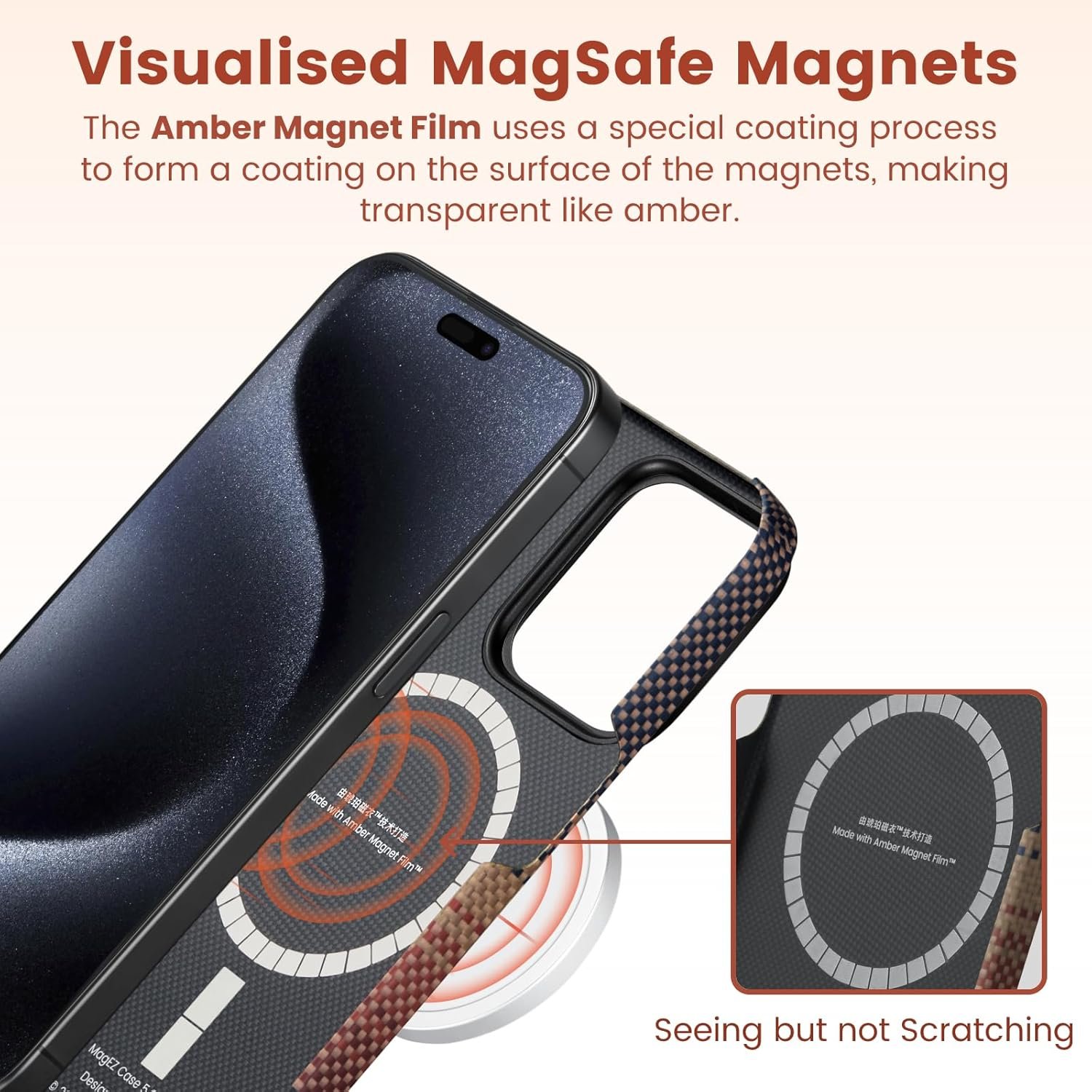 [Airy Light & Caseless Thin] Amber Magnet Film technology integrates the MagSafe ring and the protective case, reducing the overall number of layers and making the iPhone 15 Pro Max case thinner and lighter.