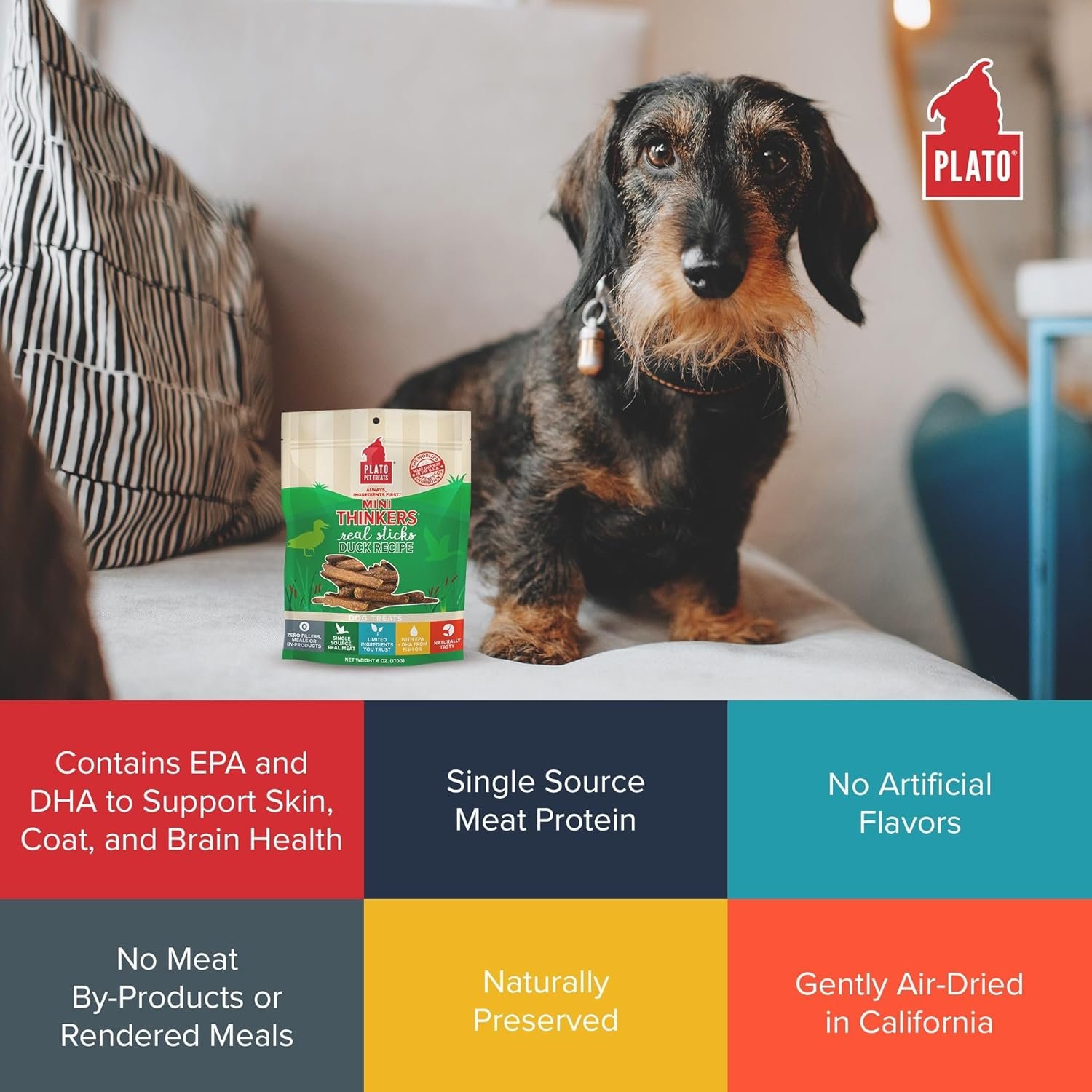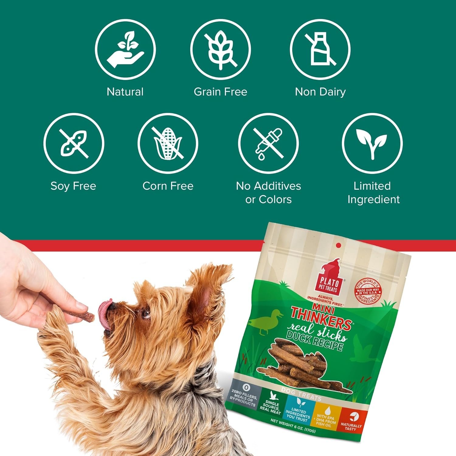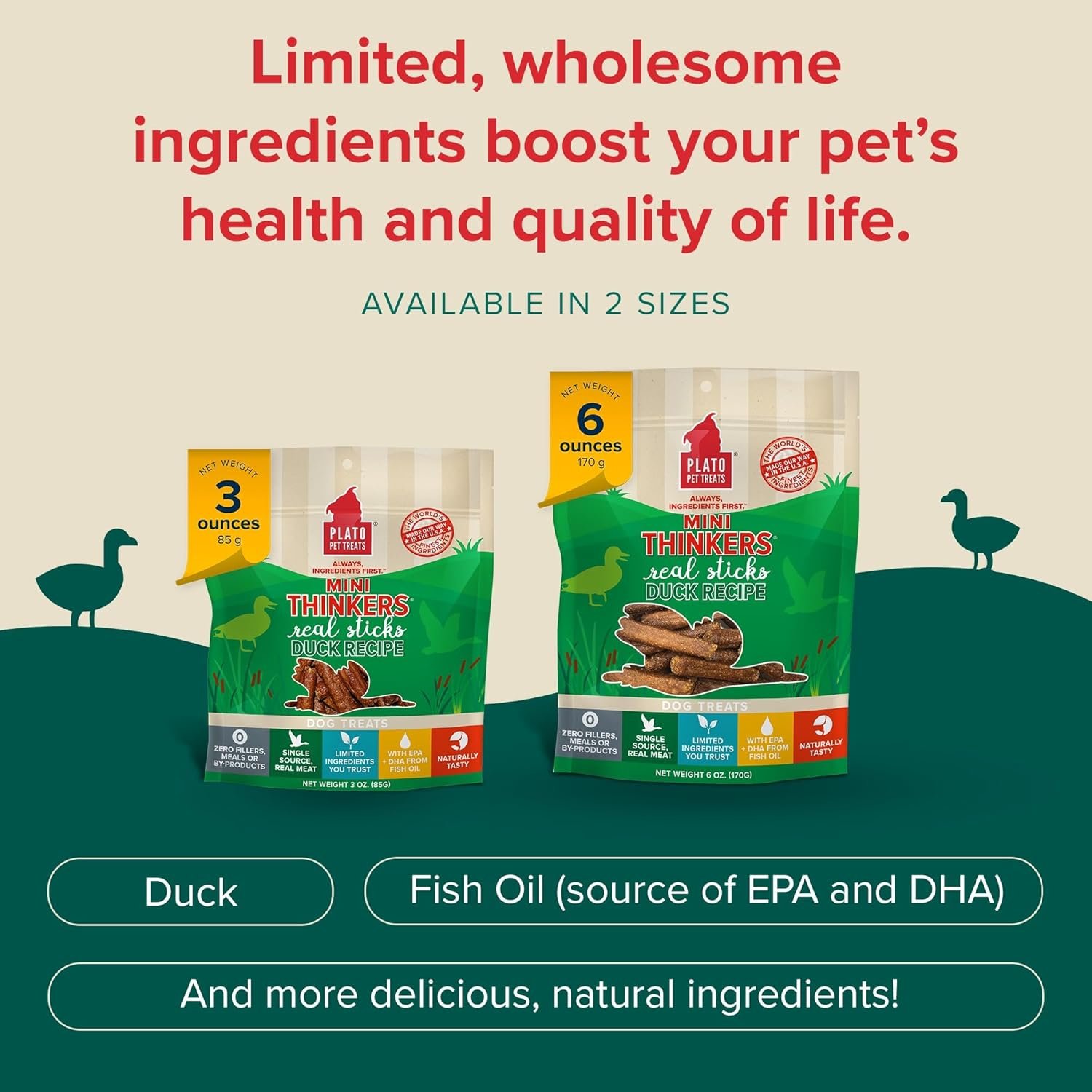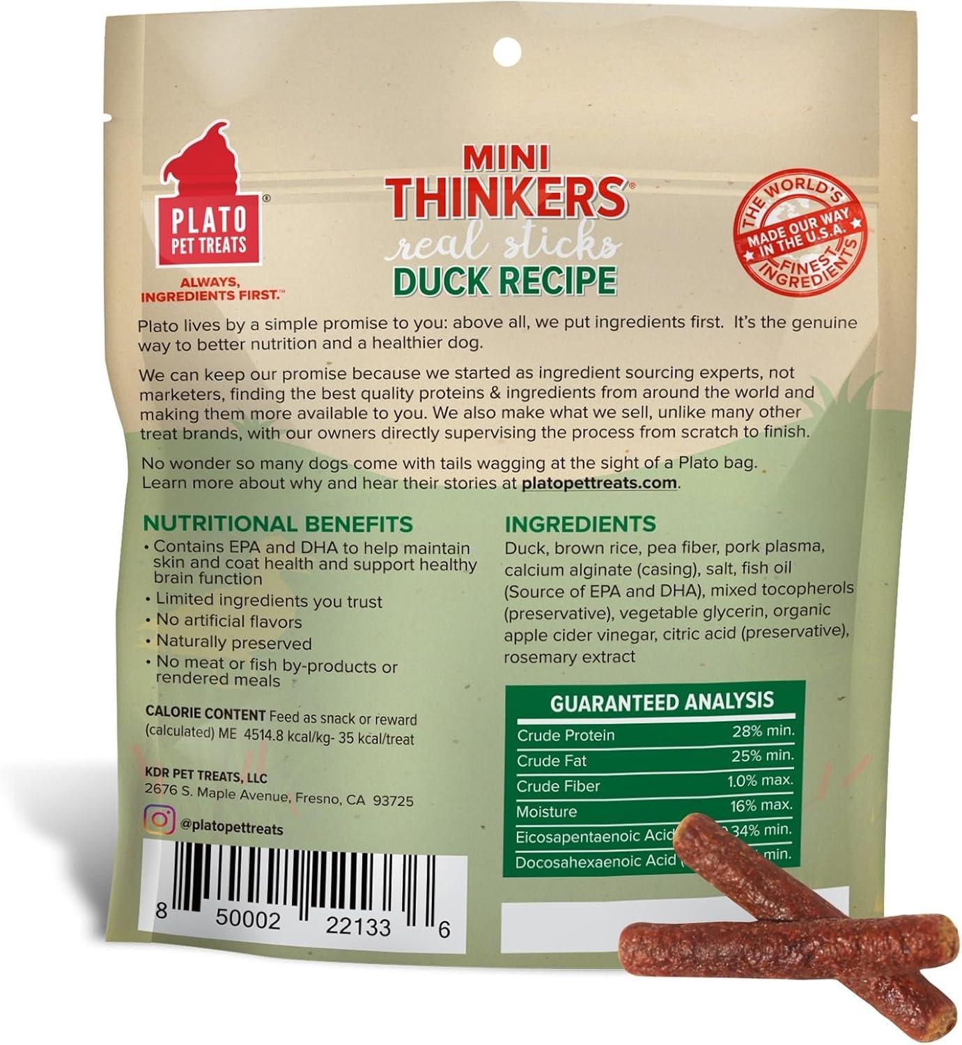 Mini Thinkers Duck are small but hearty, meat-packed sticks with added EPA and DHA to support healthy brain function. Made with real duck as the 1st ingredient, these treats are made with limited ingredients, are naturally preserved and contain no artificial flavors, corn, wheat, or soy. Mini Thinkers offer chewing satisfaction in smaller portions and are size-appropriate for smaller dogs. And we take the extra time to air-dry them in batches in our USA facility instead of baking them in order to retain more of the ingredients’ inherent nutrients (but your dog will just think that they smell and taste amazing). It takes longer, but we think its worth it. Mini Thinkers also come in Chicken, Salmon and Lamb.
