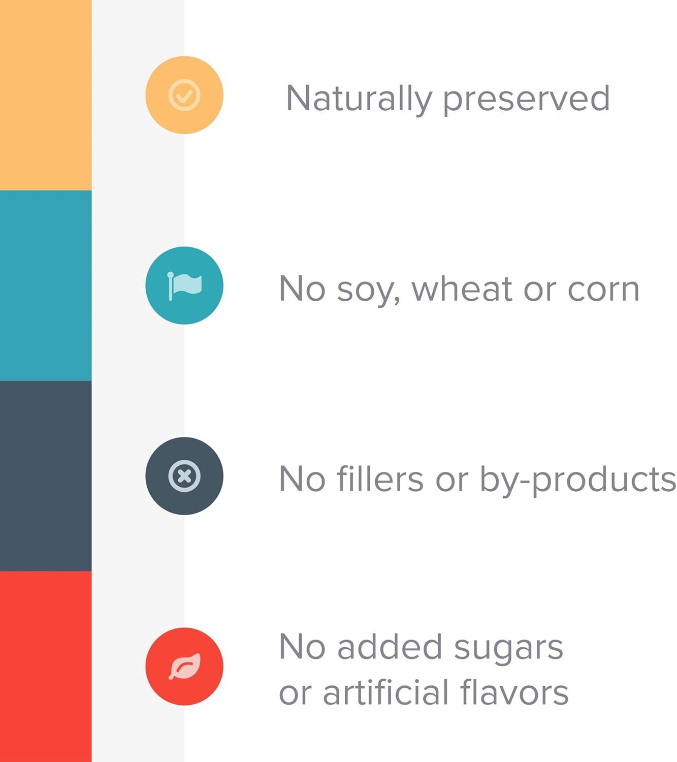 Contains no added corn, wheat, or soy; no added artificial colors, flavors or chemical preservatives