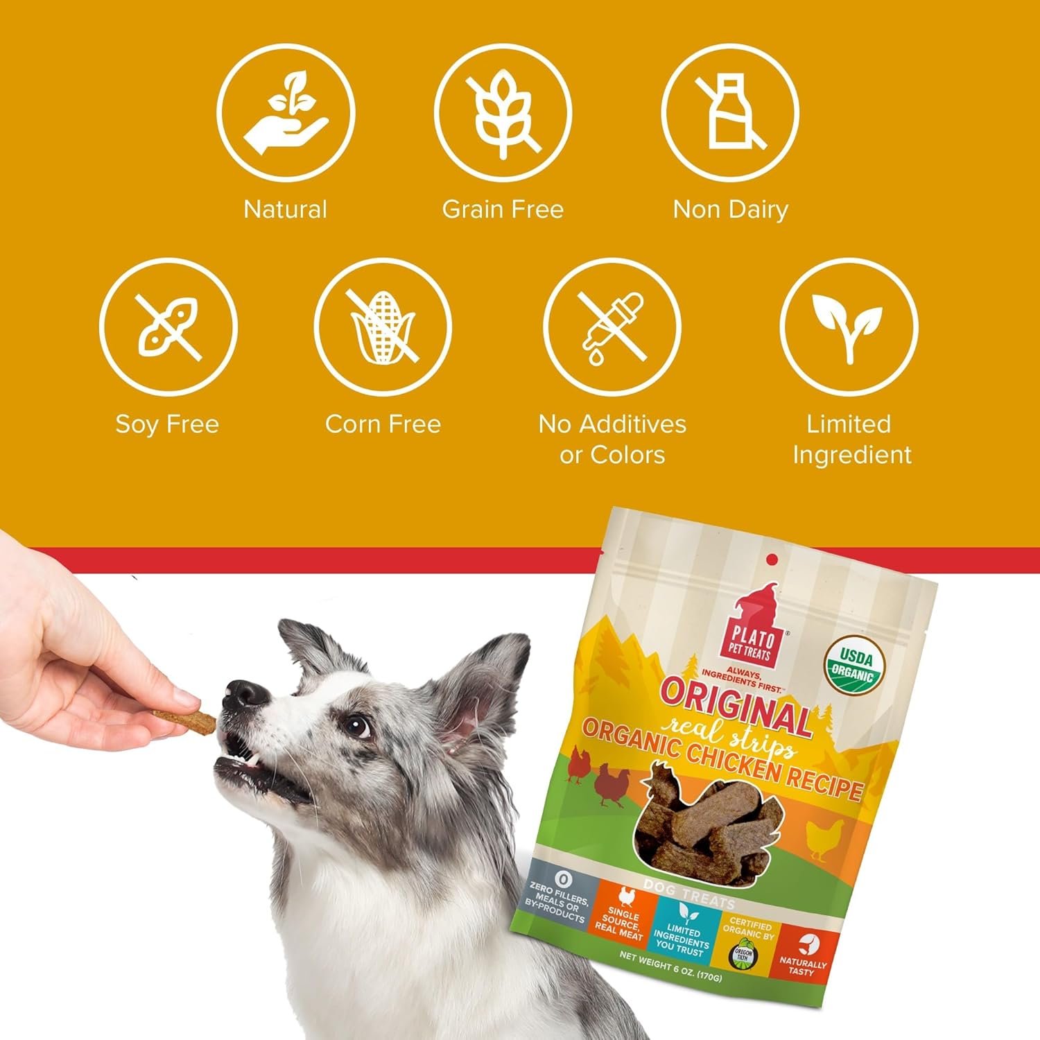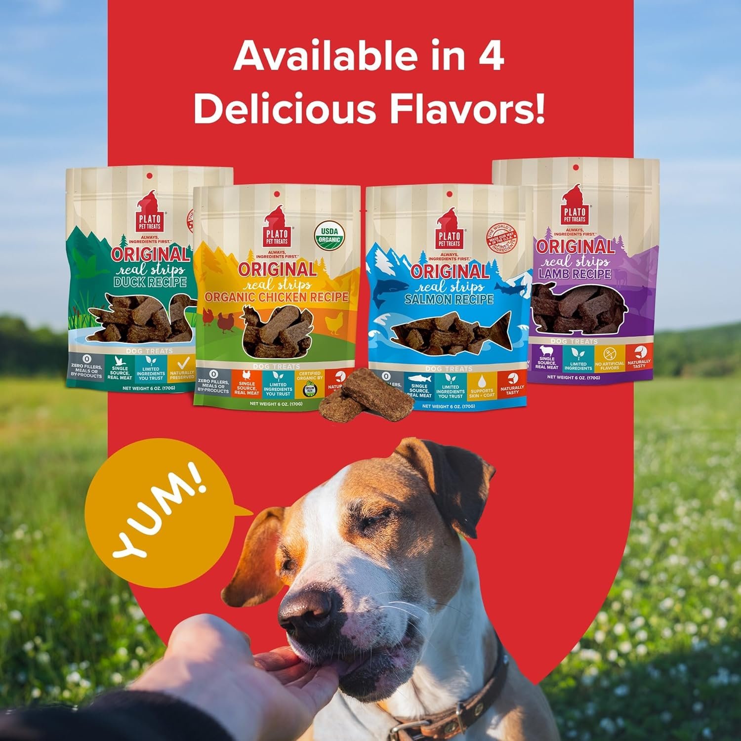 Real Strips Organic Chicken are soft textured, meat bars made with brown rice and are just the right portion size and shape for chomping.  Made with chicken as the 1st ingredient, these treats are USDA Certified Organic, made with limited ingredients, are naturally preserved, and contain no artificial flavors, corn, wheat, or soy.  They are easy to chew as is or can broken into smaller pieces for dogs of all sizes. And we take the extra time to air-dry them in batches in our USA facility instead of baking them in order to retain more of the ingredients’ inherent nutrients (but your dog will just think that they smell and taste amazing). It takes longer, but we think its worth it. Real Strips also come in Duck and Salmon.