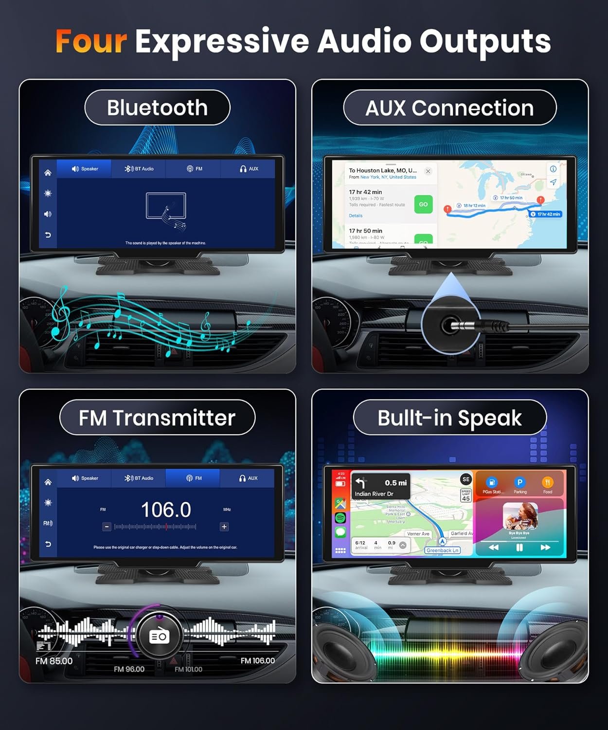 Upgraded Bluetooth Audio Output: Upgraded BT audio output options for this portable apple carplay allows you to directly connect to your car’s bluetooth to emit the sound of carplay and android auto to the car’s own speakers, enjoying the best and the most stable and high-quality stereo sound through the original car audio system. You can also use AUX connection, FM Transmitter, and the built-in speaker to get audio
