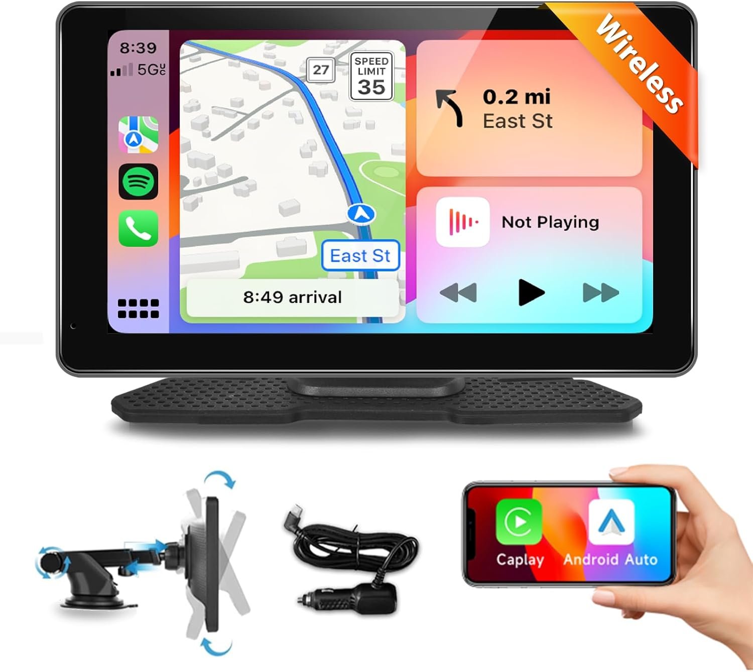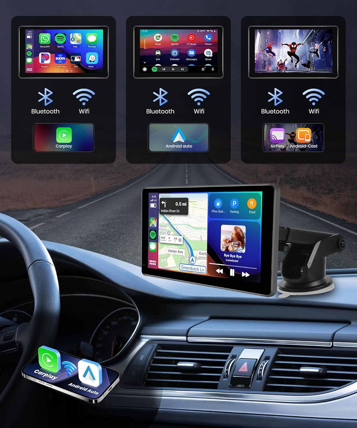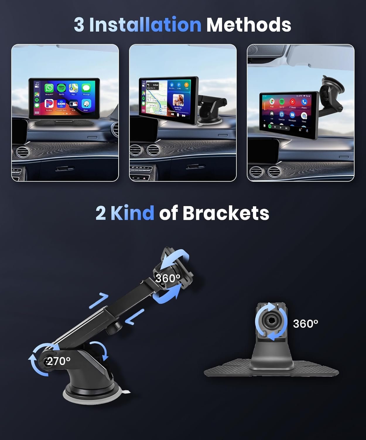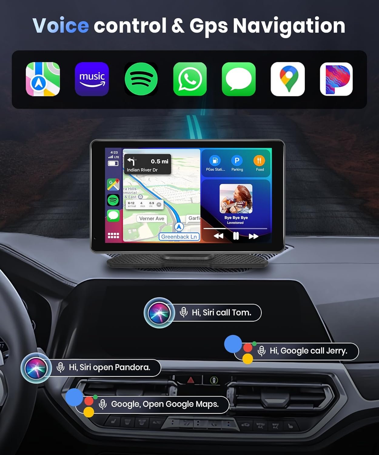 2.Wireless Carplay Portable Car Stereo: The carplay screen support wireless Car Play and Android Auto, you could more easily access the apps of your phone. You can also able to wake up the voice assistant Siri to operate Apps on this portable carplay car radio, easily use GPS navigation, calls, message, music, and much more functions while keeping your hands-free for safe driving