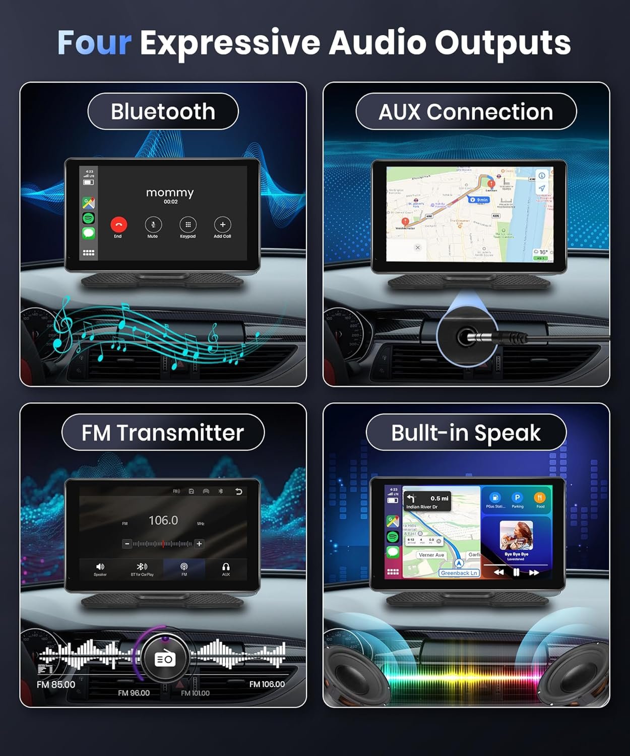 5.Upgrade Dual Bluetooth: Upgraded BT audio output options for this car play screen allows you to directly connect to your car’s bluetooth to emit the sound of carplay and android auto to the car’s own speakers, enjoying the best and the most stable and high-quality stereo sound through the original car audio system. You can also use AUX connection, FM Transmitter, and the built-in speaker to get audio