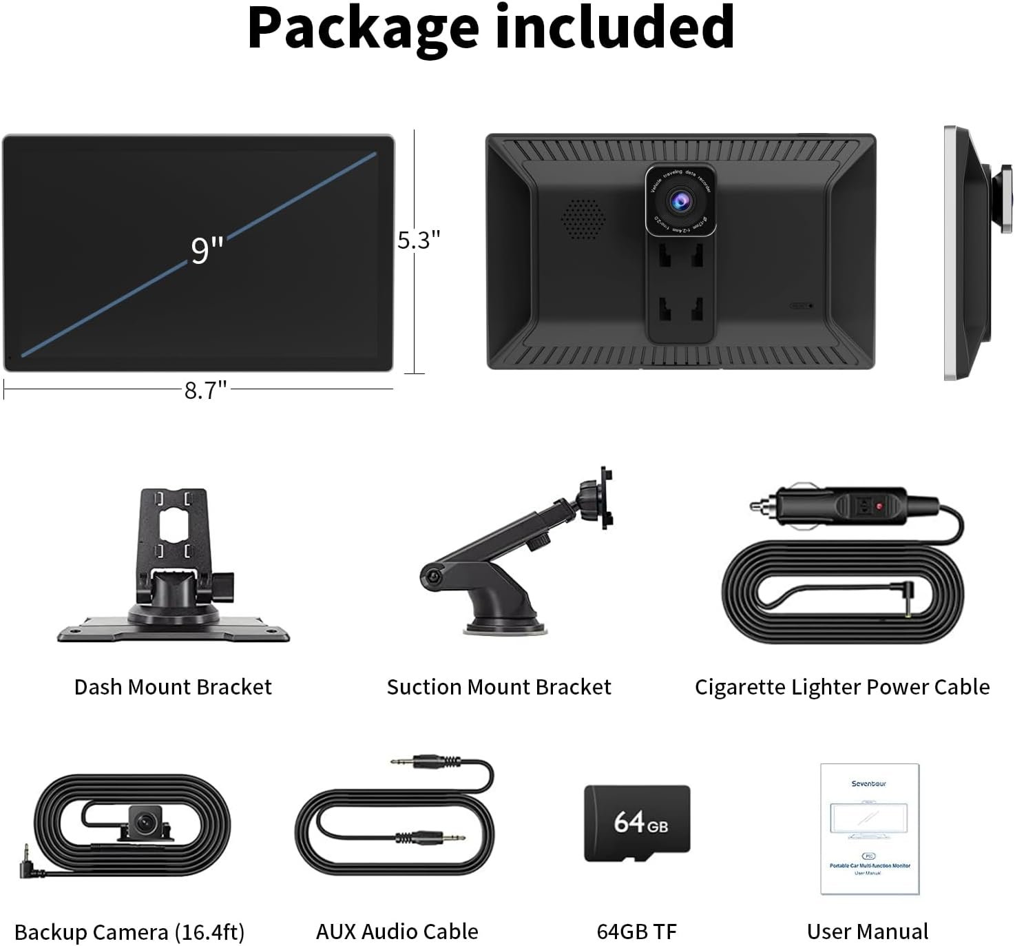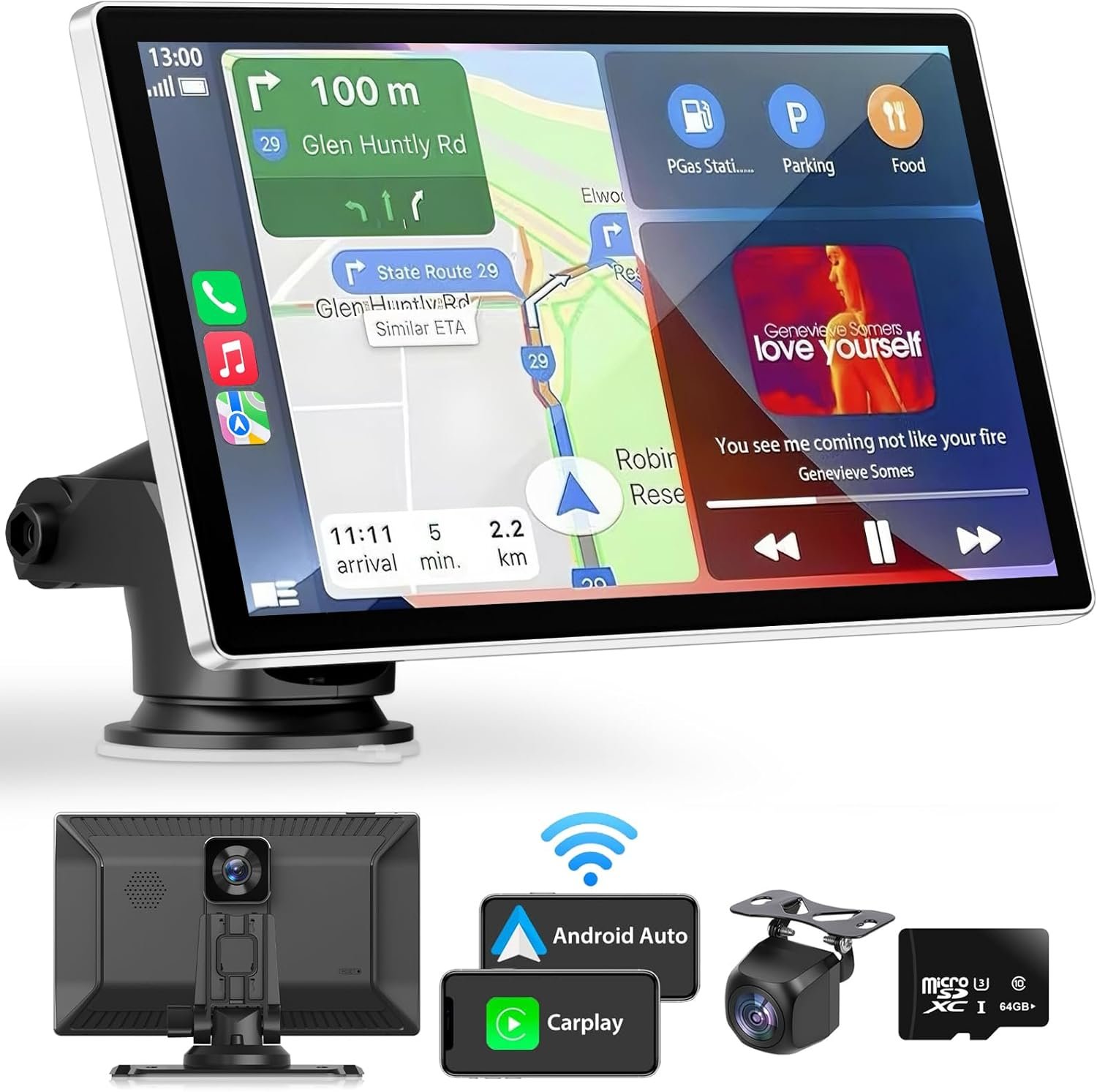 Universal for different models of cars10 seconds in installationFull angle screen adjustment availableWireless Apple CarPlay & Android AutoMirror Link for iPhone/AndroidUpgrade Bluetooth 5.2Support voice control on the CarPlay modeReal-time map navigationFront 4k loop recordingRear camera 1080pSupport AUX outSupport FM transmitter (not for FM radio receiving)Support steering wheel control9 inch IPS touch screen