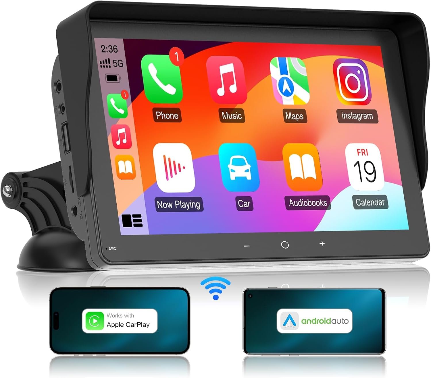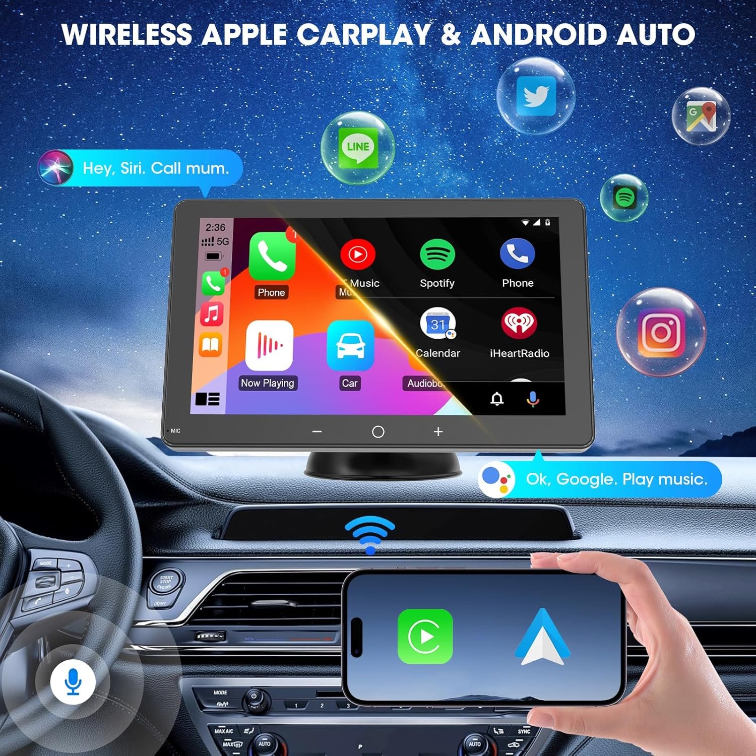 WIRELESS APPLE CARPLAY & ANDROID AUTO: Fast pairing to Bluetooth and wifi, this portable car radio becomes carplay/android auto functionality and a navigation tool instead of a mounted phone-as-a-GPS game, you can easily access to your phone’s apps, maps, music, videos, calling, and speaking to Siri or Google while driving, this apple car play screen elevates your audio experience to an easy hands free effect without any hardwired install, ensuring a clutter-free environment in the vehicle