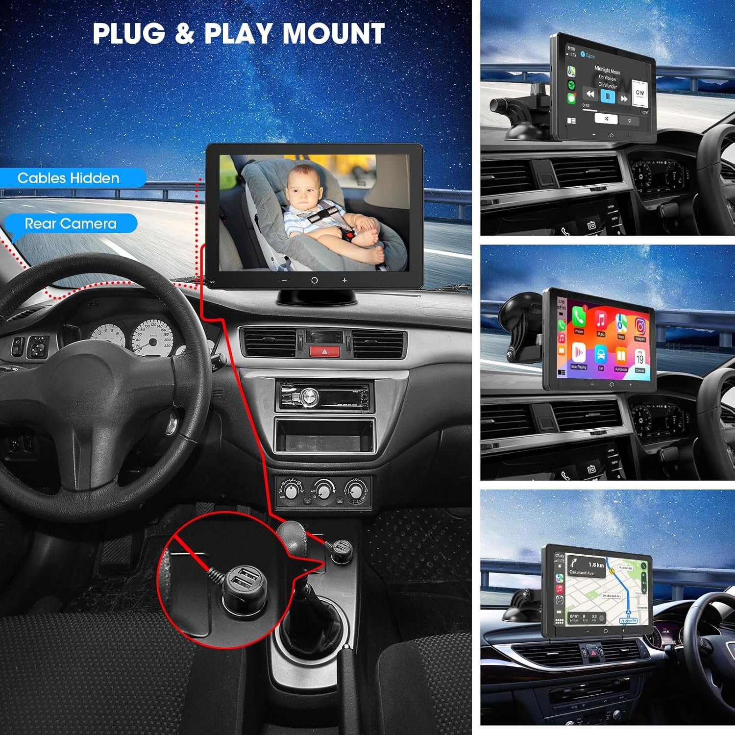 PLUG & PLAY MOUNT FOR VARIOUS CARS: Mount it directly on the dashboard or windshield, no need to disassemble your car’s original console. With 12-24v voltage, the add carplay screen could upgrade all different car’s infotainment system, like campers RVs, trucks, vans, pickups, etc.