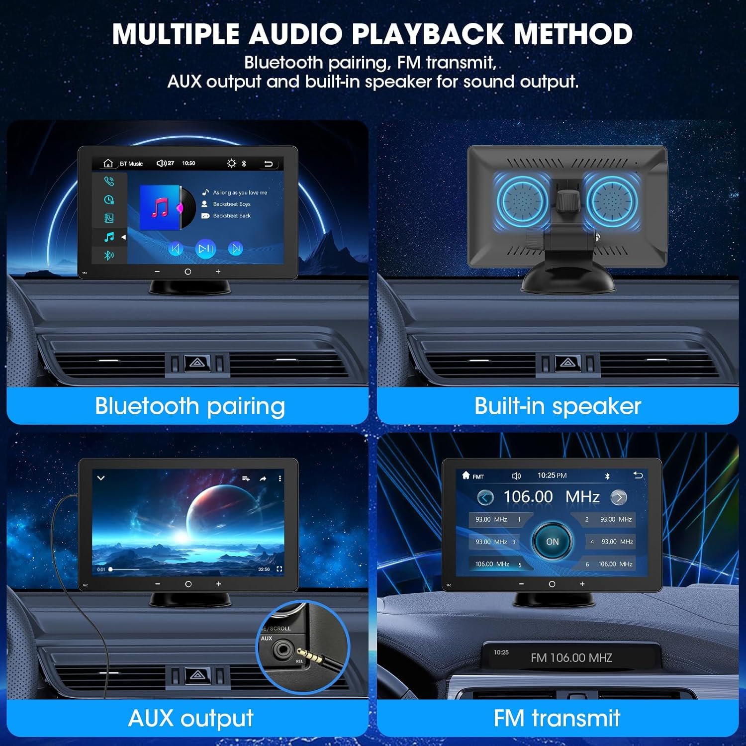 MULTIPLE OPTIONS FOR AUDIO PLAYBACK: The car play display screen supports streaming the sound through the FM transmitter and the included aux cable, all audio could be played through the original car speakers