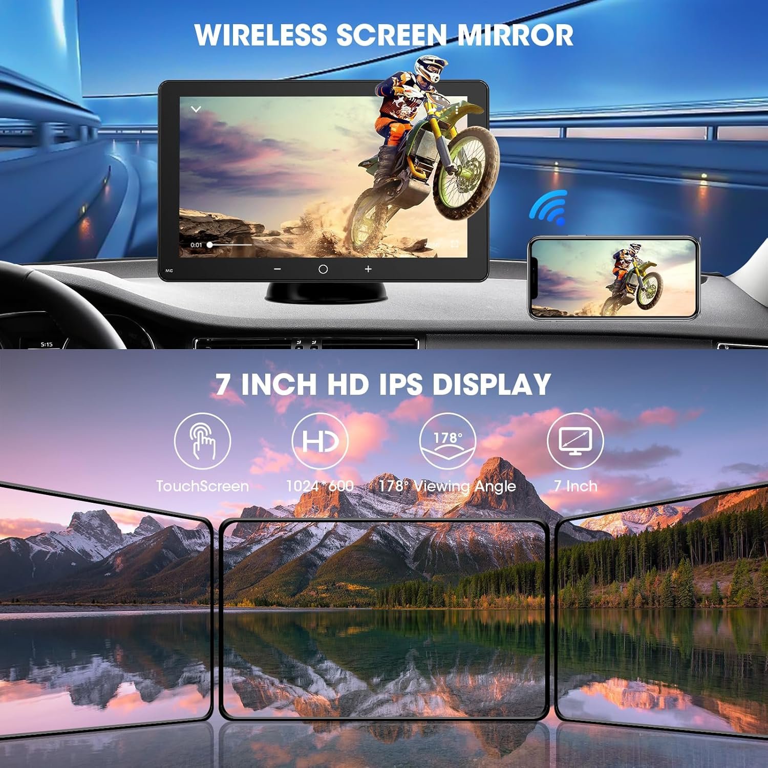 7 INCH HD IPS DISPLAY: The dashboard carplay touchscreen with high resolution 1024*600 and 178°full-viewing angle let you enjoy an immersive and clear viewing experience. The responsiveness and brightness of the external car screen make it easy to navigate through the different features and quick toggle between day and night modes to adjust the brightness