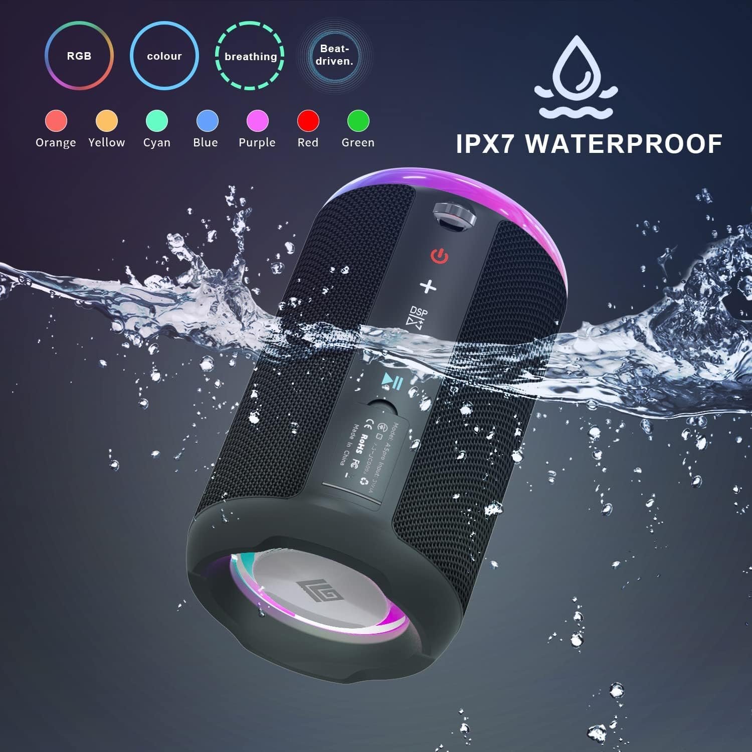 Portable Bluetooth Speaker with LED Lights, Stereo Sound Speakers Bluetooth Wireless with IPX7 Waterproof, Dual Pairing Speaker, Answering Calls and Voice Assistant Party/Home/Outdoor/Beach