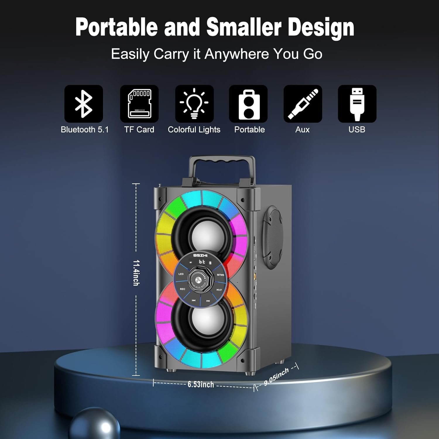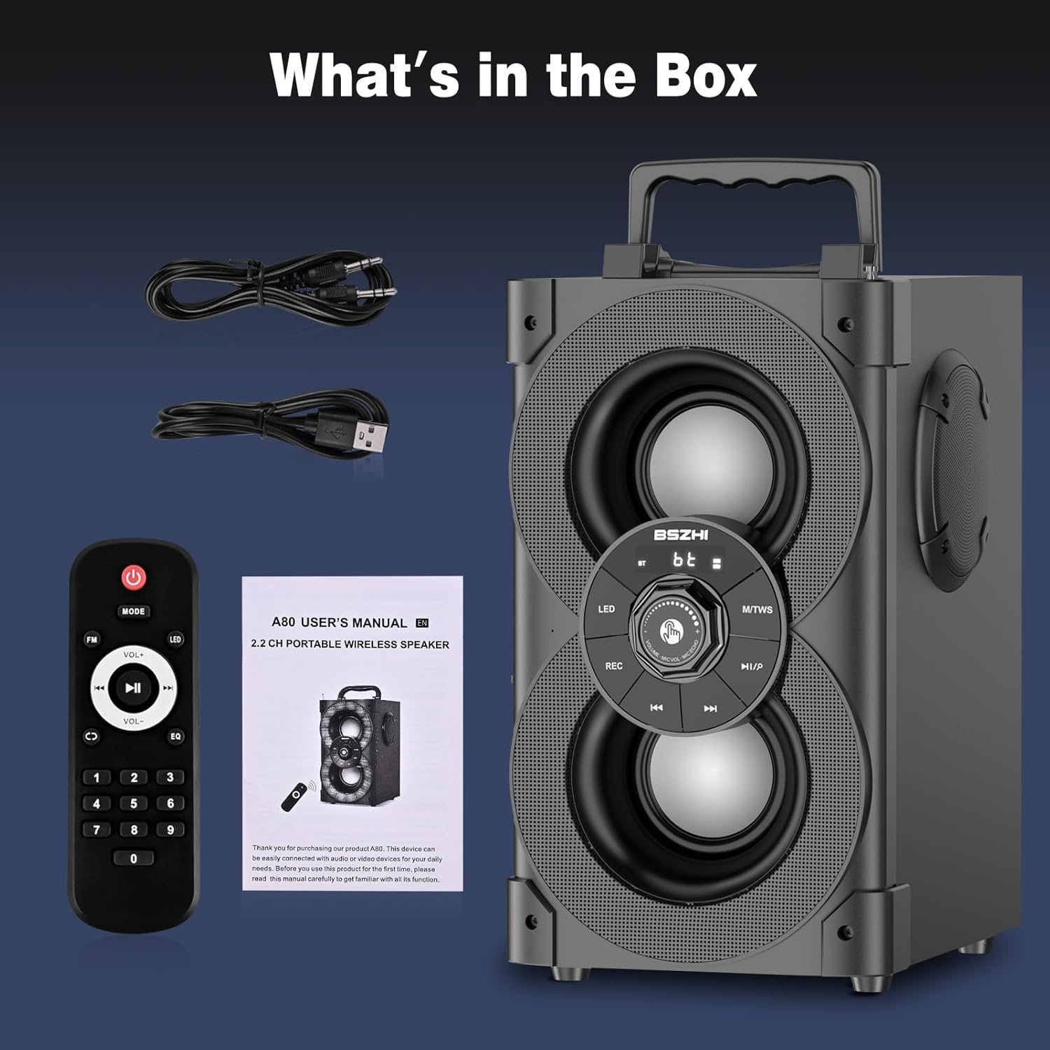 The A80 portable bluetooth speaker support TWS, FM radio, TF Card music playback, AUX input, U-disk music playback, remote control and 6.35MM Microphone jack. The A80 portable Speakers built-in advanced Bluetooth 5.1 wireless transmission, working distance up to 100ft range, easily connectable all Bluetooth-enabled device, such as your cellphone, tablet, laptop, and all other bluetooth devices.