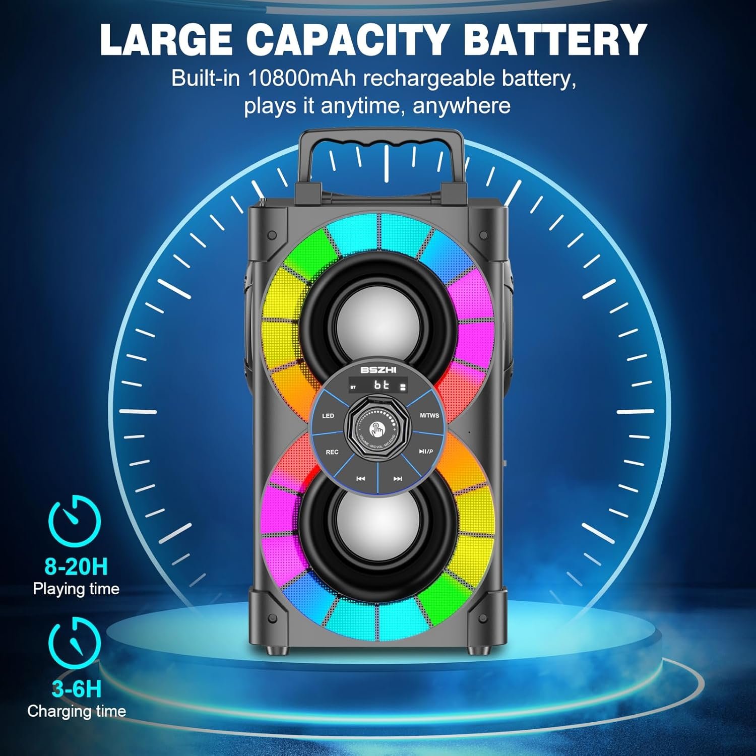 This A80 Portable Speaker compact design and ergonomic carrying handle make it easy to carry around and enjoy your favorite music anywhere you go. It’s built_in 10800mAh large-capacity battery, you can enjoy a karaoke carnival party at home, in the garden, or outdoors anytime, anywhere!
