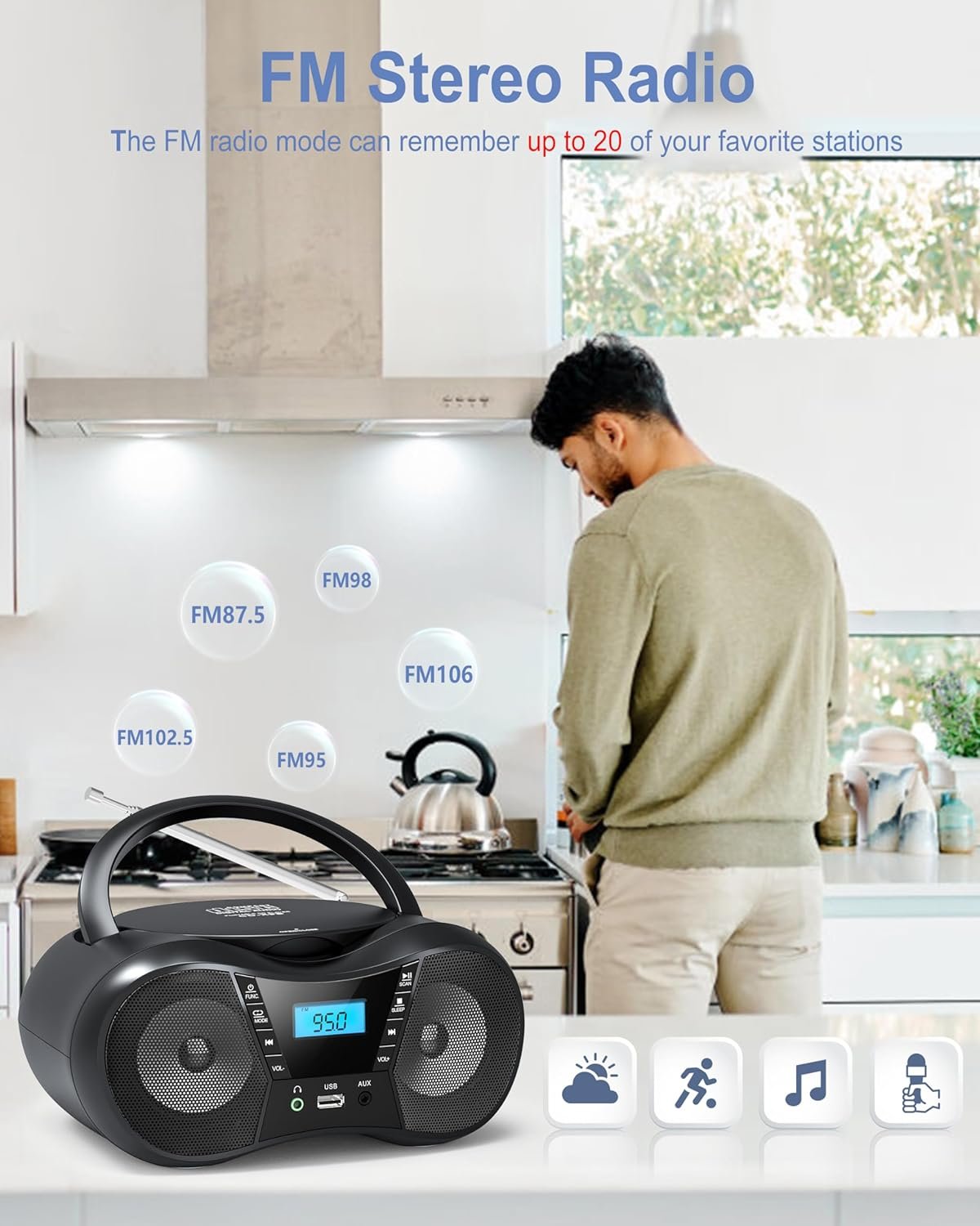 【FM Radio Time】: This radio cd boombox adds an FM station feature with a band from 87.5-108 MHz, receiving clear station signals whenever and wherever they are. It can automatically search for valid stations and can preset up to twenty stations in this cd boombox.The large LCD screen allows you to easily view the mode you are in,station information; time; etc. which you can use to listen to news; sports; talk shows or any of your favorite stations at work or at leisure on this cd player boombox