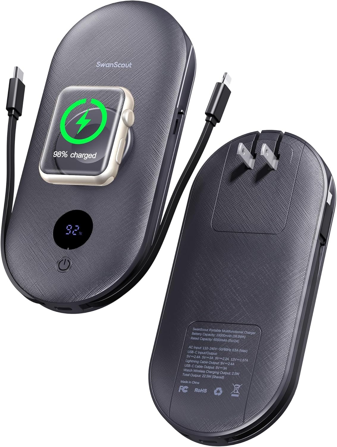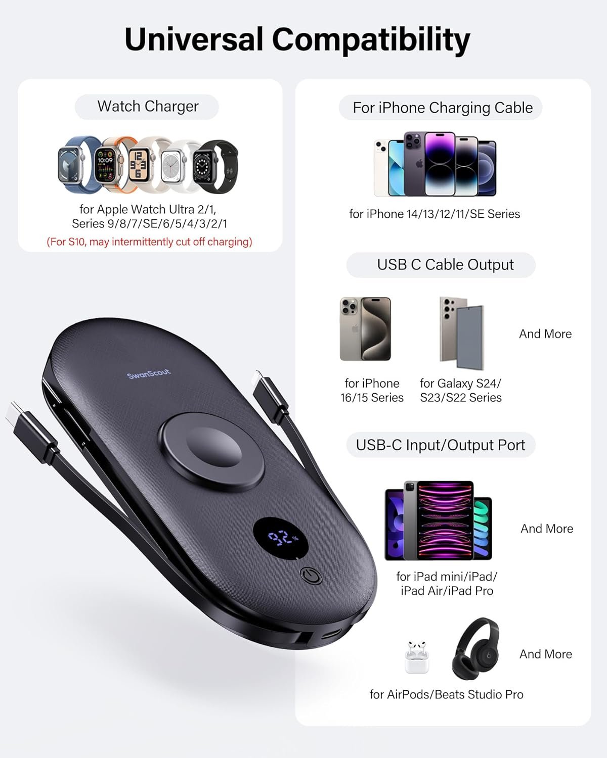 Convenient for All Devices – Say you’re out and your phone, watch, tablet or headphones are low on power. There is nowhere to plug in. Well, reach into your bag and take out SwanScout 302A. Just attach your watch (ONLY FOR Apple Watch) or connect your devices to the charger, no cords needed