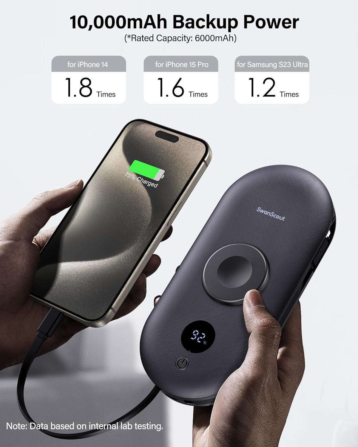 Digital Power Display – The display shows how much power it has left. 100% Capacity is 10000mAh (Rated Capacity is 6000mAh), which can charge iPhone 15 Pro about 1.6 times