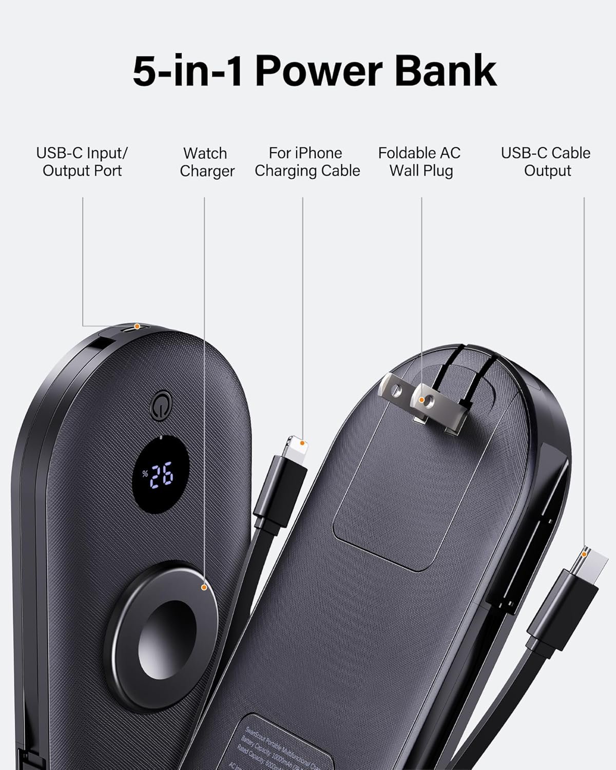 Ease of Use – The portable charger has two built-in cables, a AC wall plug and a USB-C port. Charge for Apple Devices and other USB-C Devices via the built-in cables or USB-C port. And recharge the charger via the AC wall plug or USB-C charging port