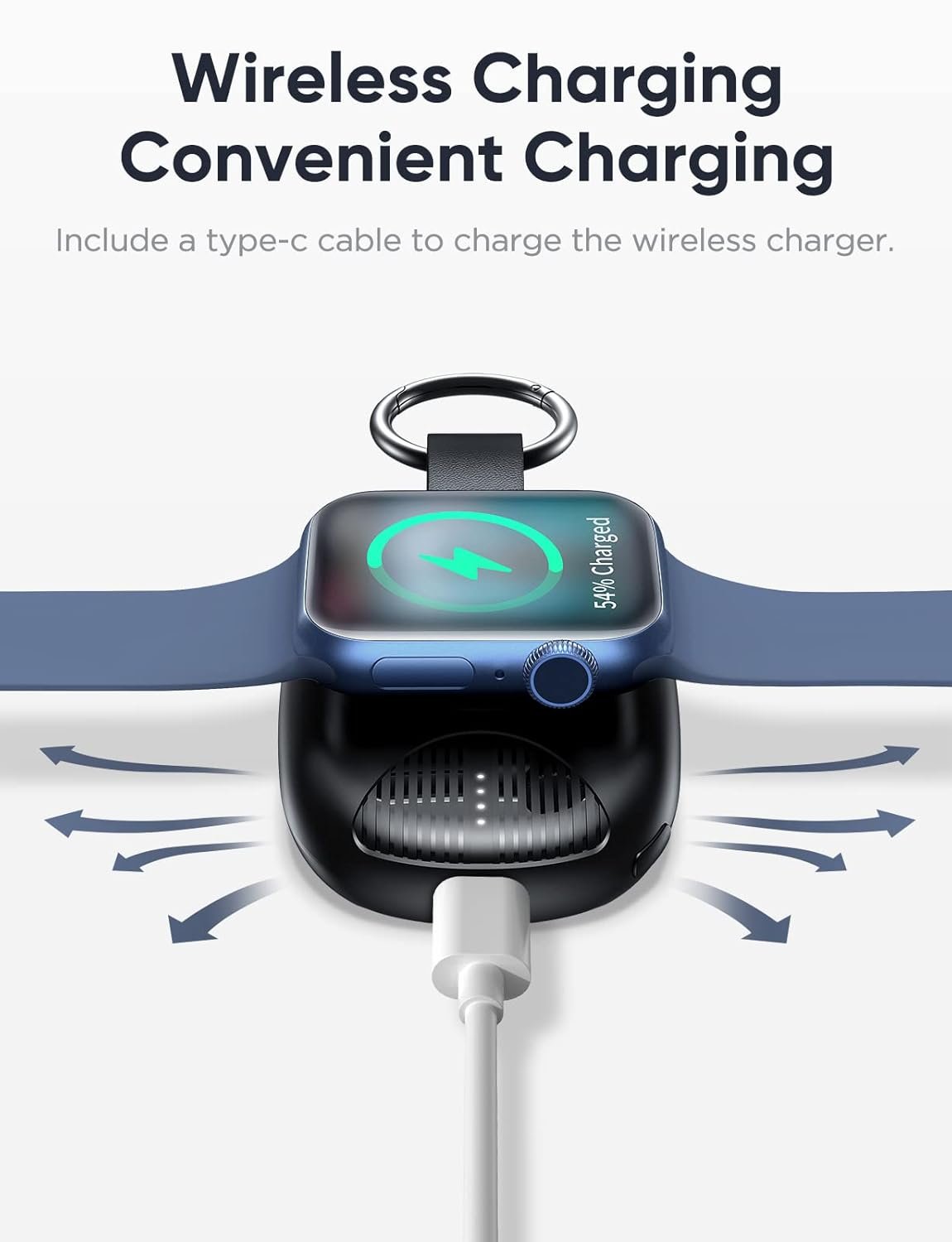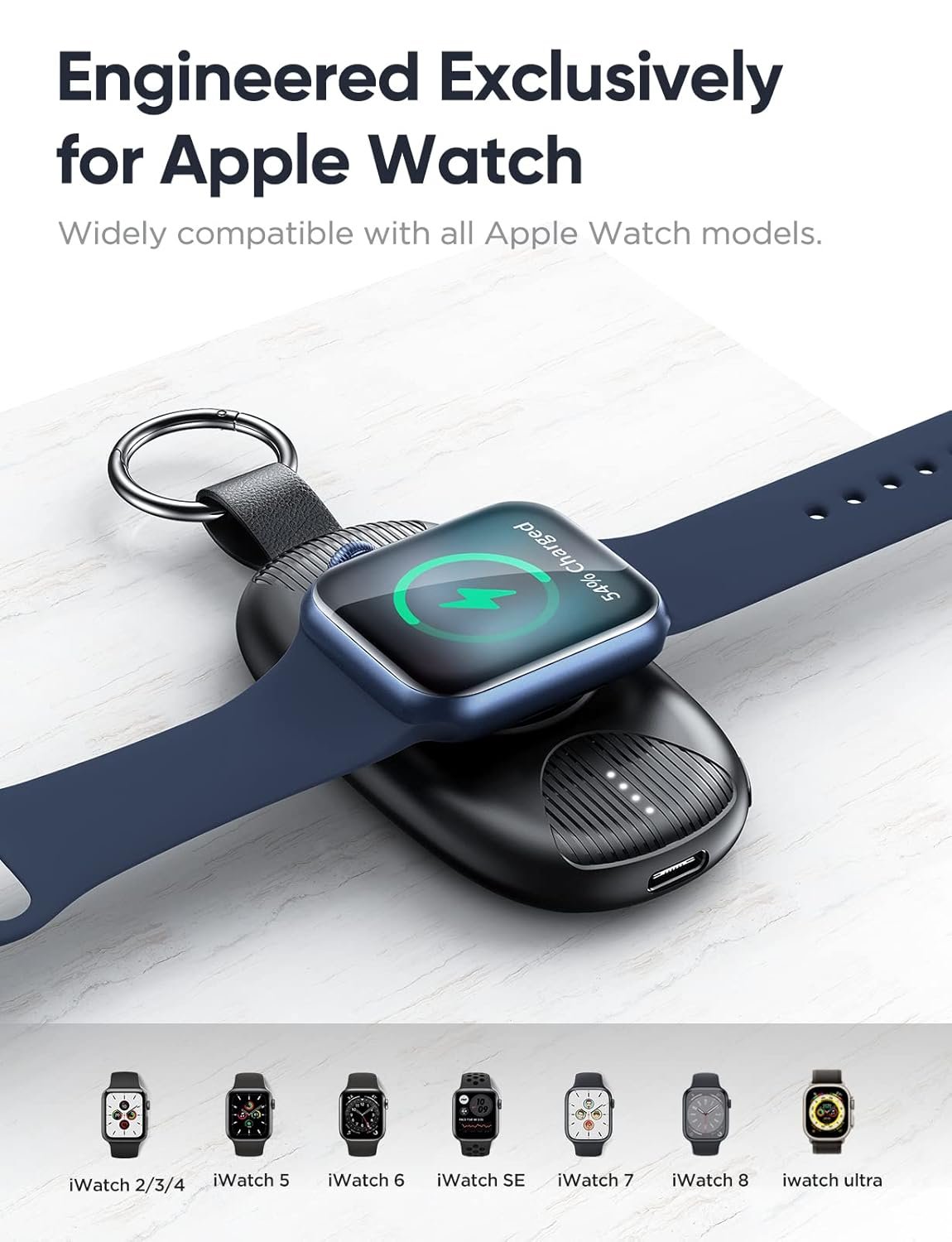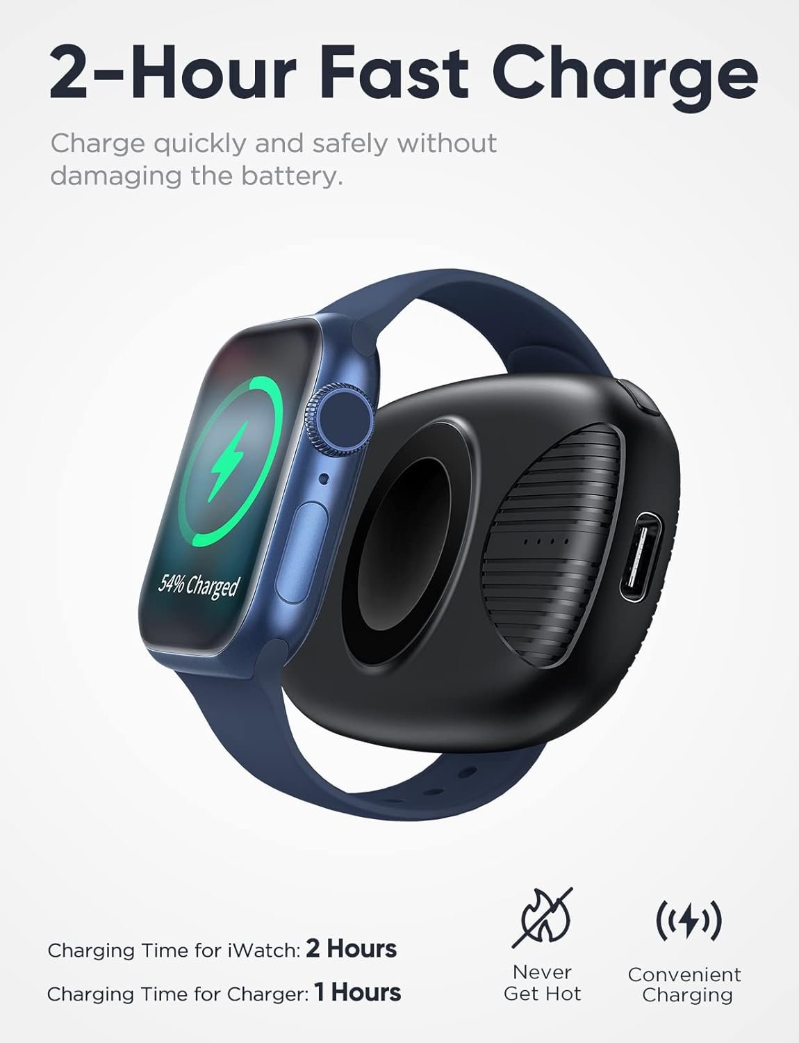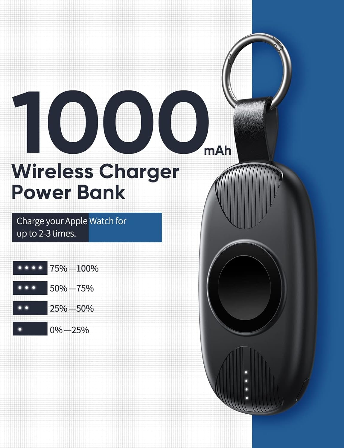 Magnetic Power Bank for Wireless Charging:Built-in 1000mAh battery offers 2-3 times of charge for your watch. Magnet design enables the apple watch charger to align correctly and start charging instantly once the magnetic charger gets close to the back of the iWatch. Charge your iWatch wherever and whenever you want without connecting to cables