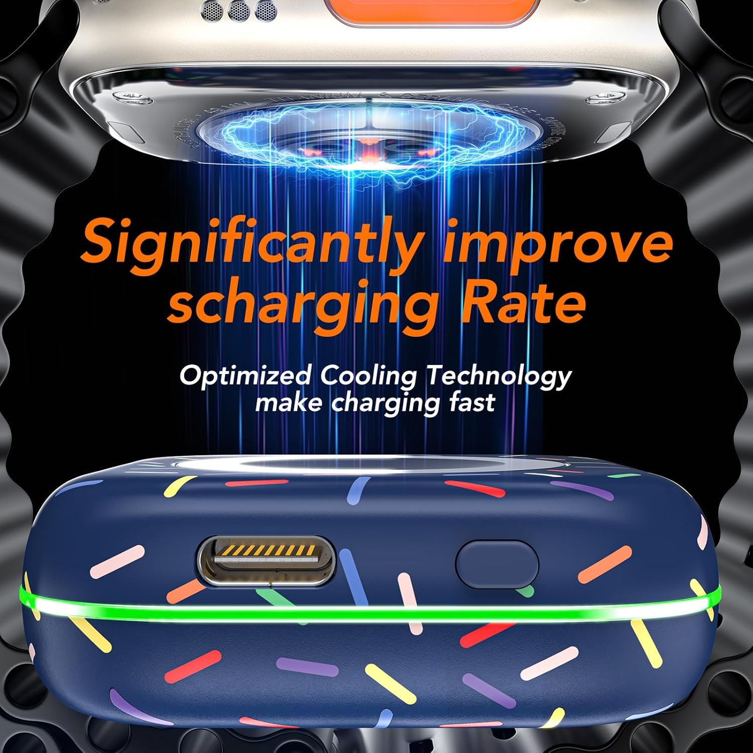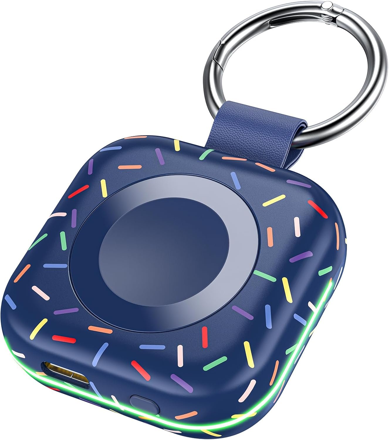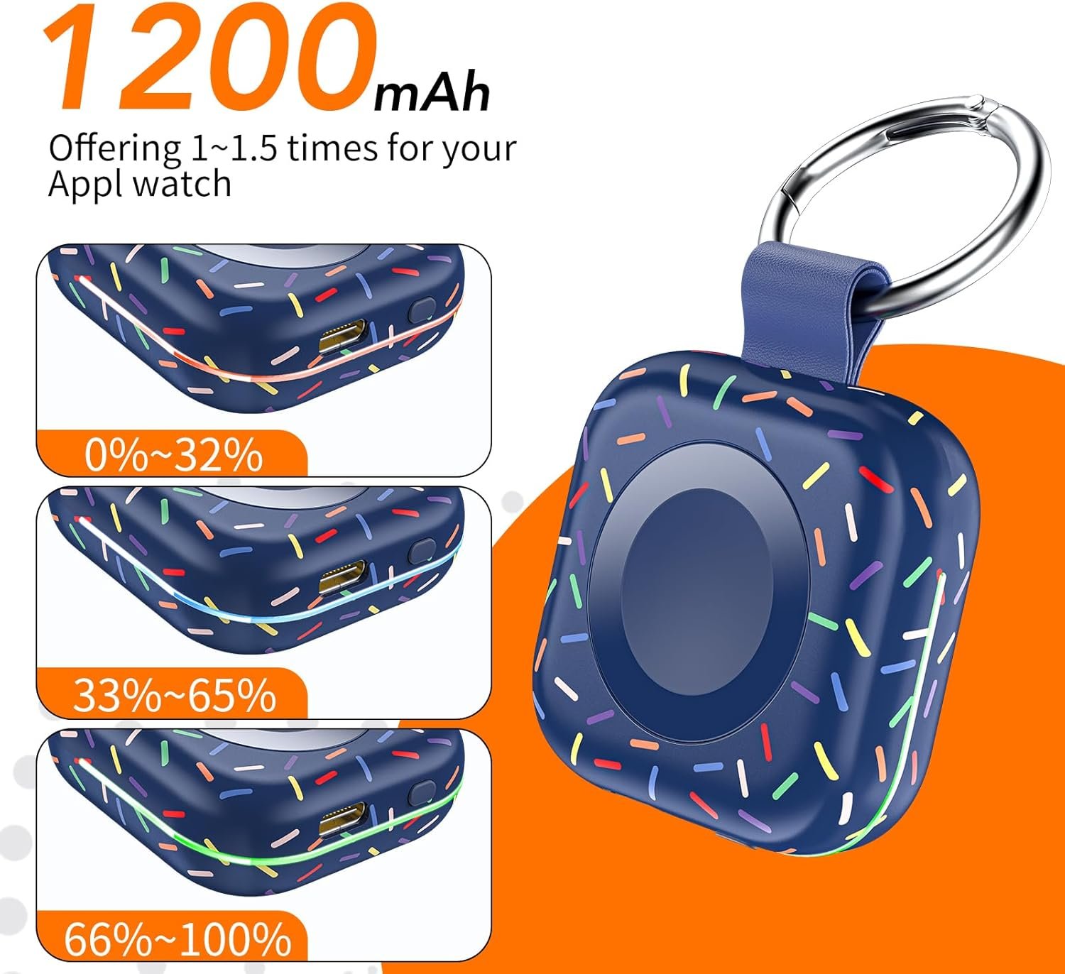 Mini Compact: The size of the cute keychain portable charger for apple watch is about the size of your watch.The comfortable frosted feel makes people love it.New indicator light design(0-30% Red Light,30%-60% Blue Light,60%-100% Green Light), fashion, keychain design,Convenient for all kinds of travel