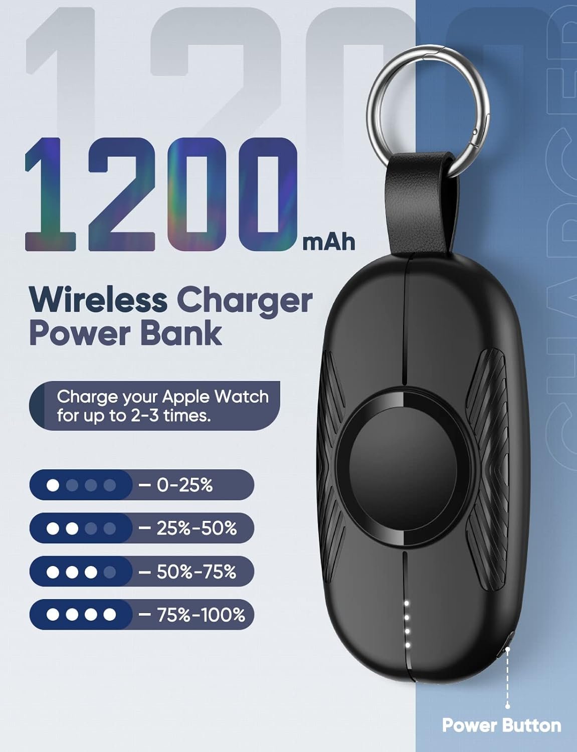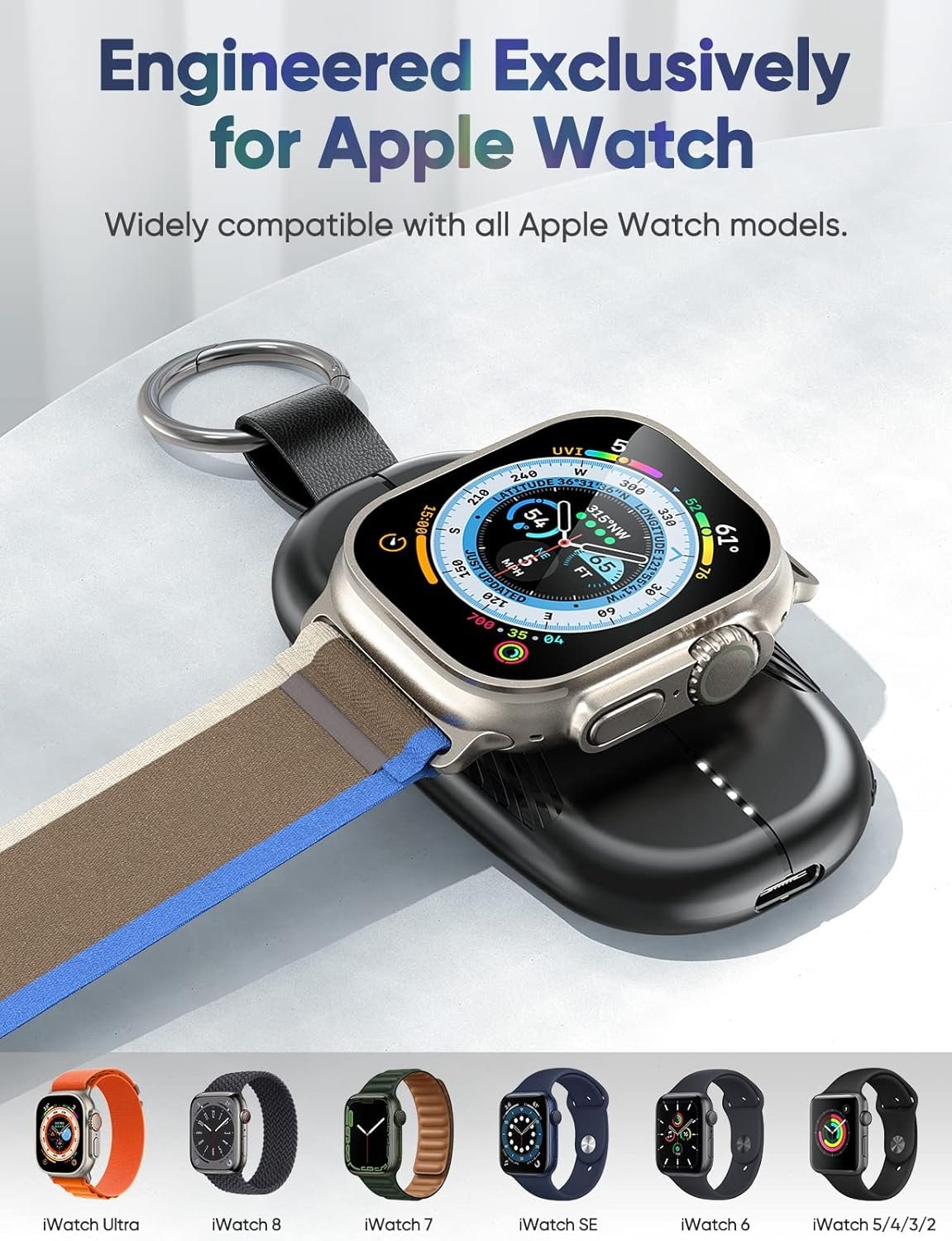 Portable Charger for Convenient Charging. Our Apple Watch keychain charger features a tiny size, portable and compact design, making it possible and convenient to carry around for daily or travel use. Slide the car key-sized wireless charger to your pocket/wallet, or clip it onto your key ring or backpack zipper to avoid dropping it accidentally.