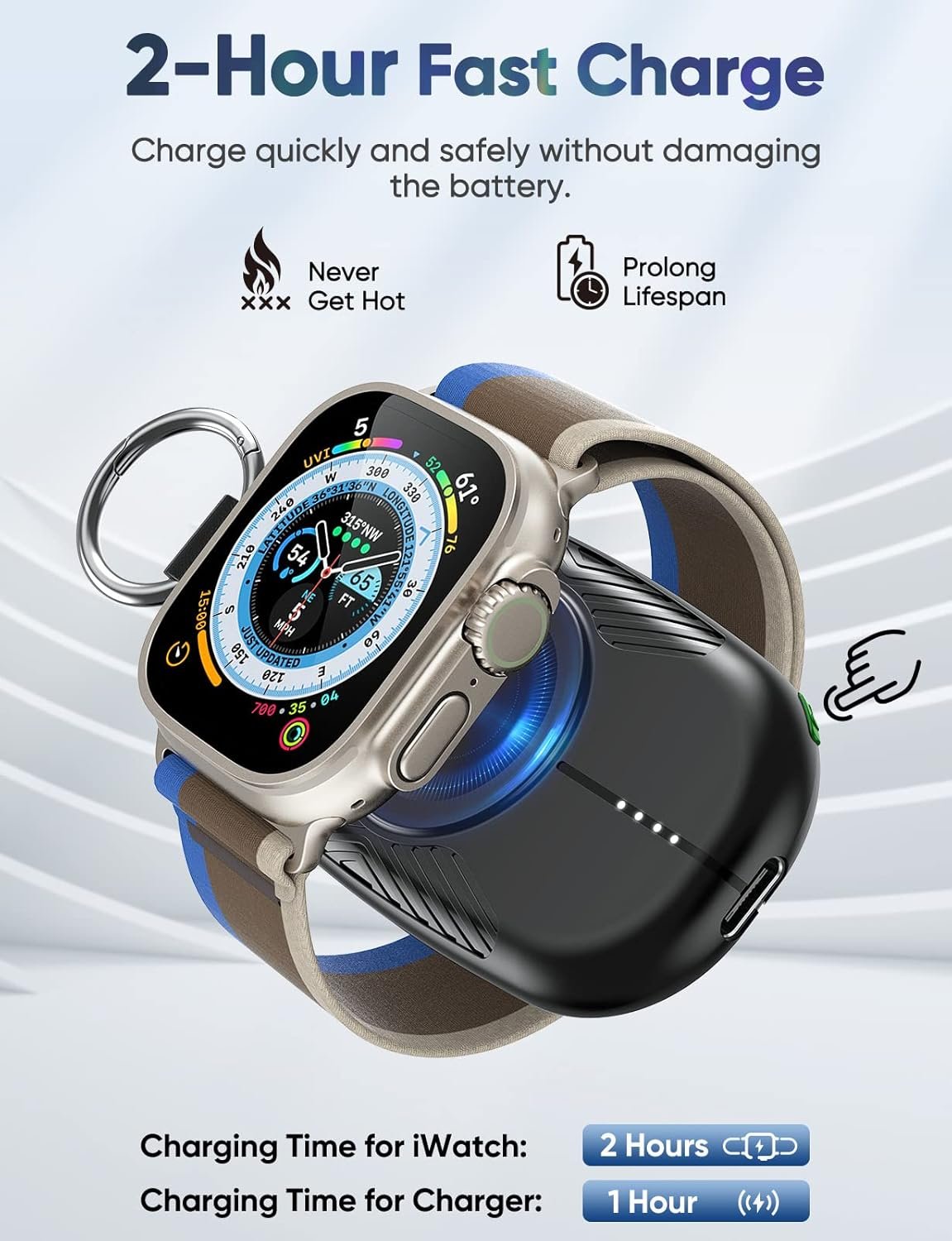 Magnetic Power Bank for Wireless Charging. Built-in 1200mAh battery offers 2-3 times of charge for your watch. Magnet design enables the apple watch charger to align correctly and start charging instantly once the magnetic charger gets close to the back of the iWatch. Charge your iWatch wherever and whenever you want without connecting to cables.