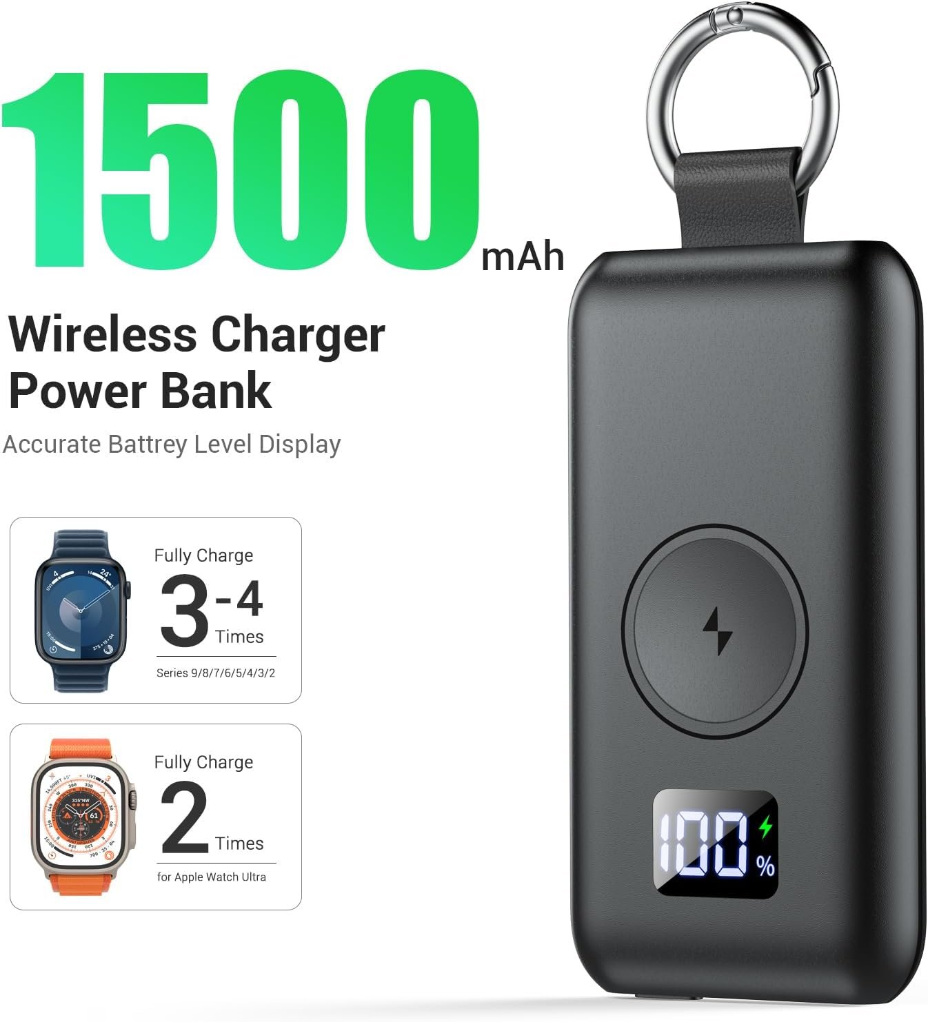【1500mAh Capacity】This power bank for Apple Watch has 1500mAh battary capacity,so that this wireless charger for iwatch provide high speed charging experience, fully charge your apple watch only takes 2.5~3 hours,and it also can charge your iWatch for 2-3 times after this portable iWatch Magnetich charger get fully charged. (NOTE: Touch the side button once to start wireless charging for the Apple Watch).