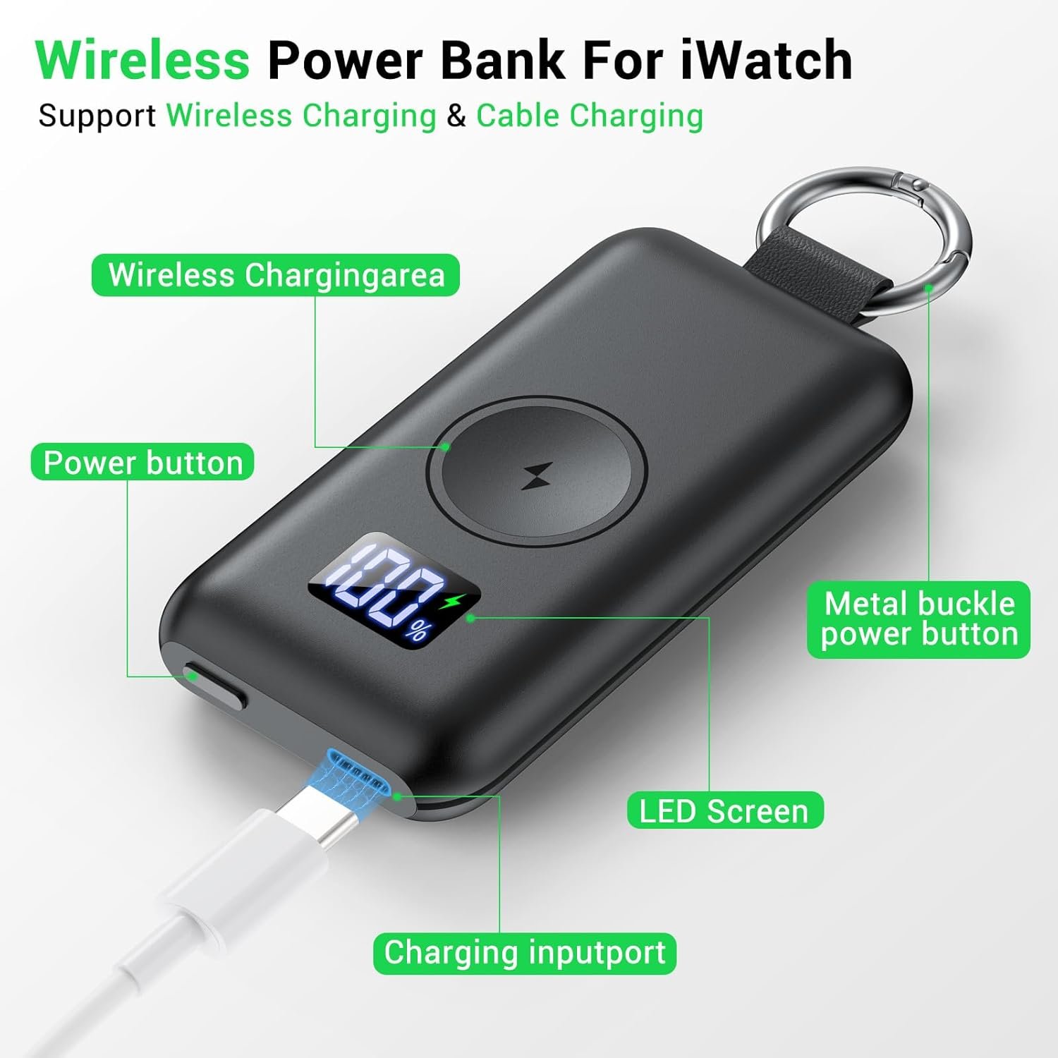 【What You Get & Charge On the Go】 This wireless charger is easy to store and convenient to carry due to its Compact & Portable design. The hanging rope allows you to hang it on a bag. Perfect for use at home, office, business trips, and travels. What you will get: 1* Portable charger for apple watch; 1* Type-C to Type-C charging cable;1*keychain; 1* User manual.