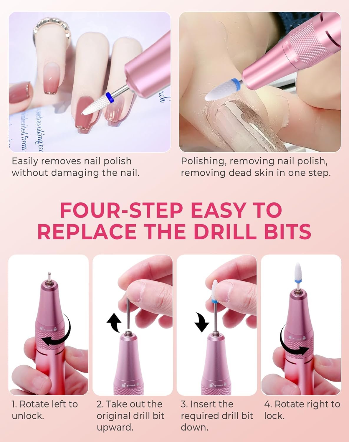 Usability and Design: The nail filer electric’s robust rotation handles various tasks with ease, while switching bits and changing rotation direction is simple and quick. Lightweight and comfortable to hold, it enhances your manicure experience. Plus, the operation is pleasantly quiet, catering to those sensitive to noise.
