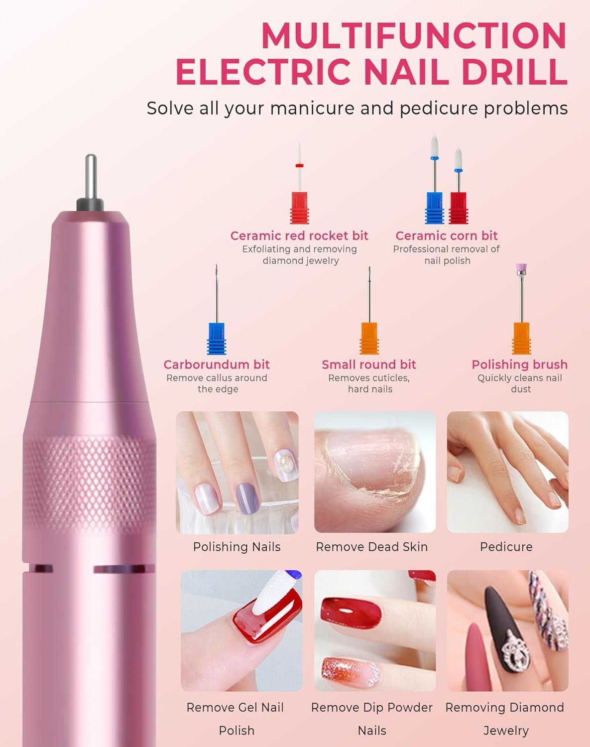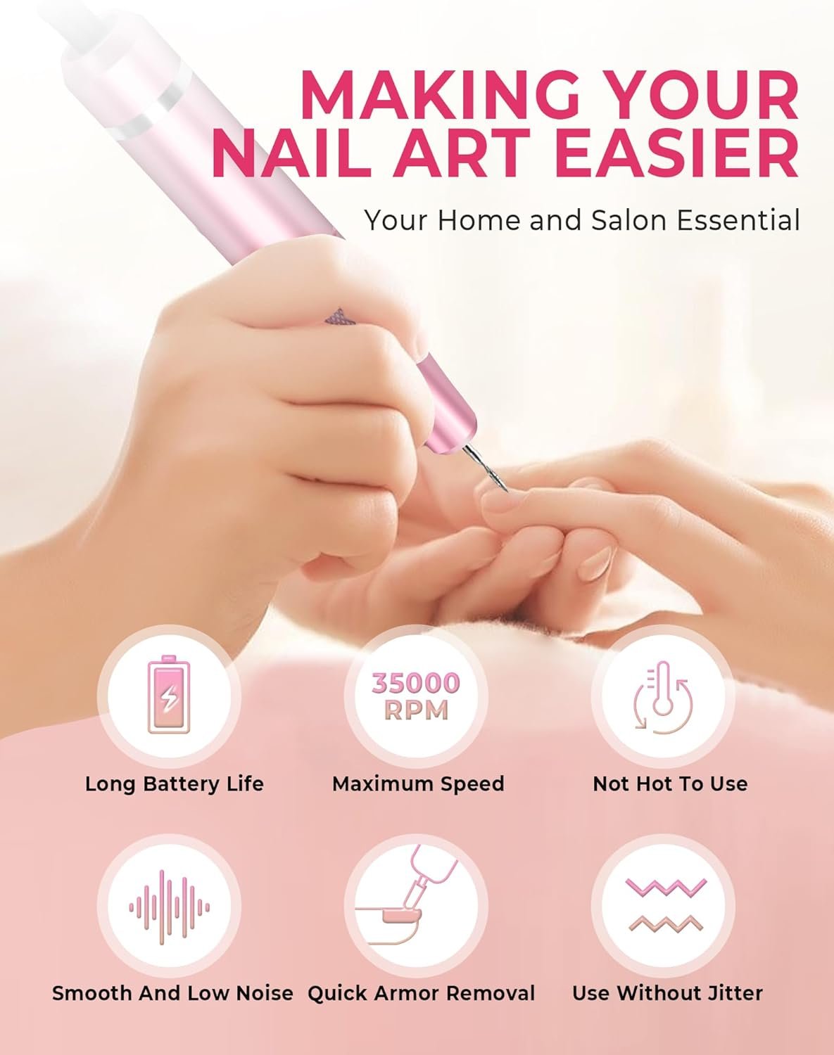 High Speed Operation: With a powerful motor that reaches up to 35000 RPM, this professional nail drill easily handles gel, acrylics, calluses, and thick nails, make it incredibly versatile and convenient. The two-way rotating function and one-click pause/start are incredibly convenient, catering to both professional nail technicians and DIY enthusiasts.
