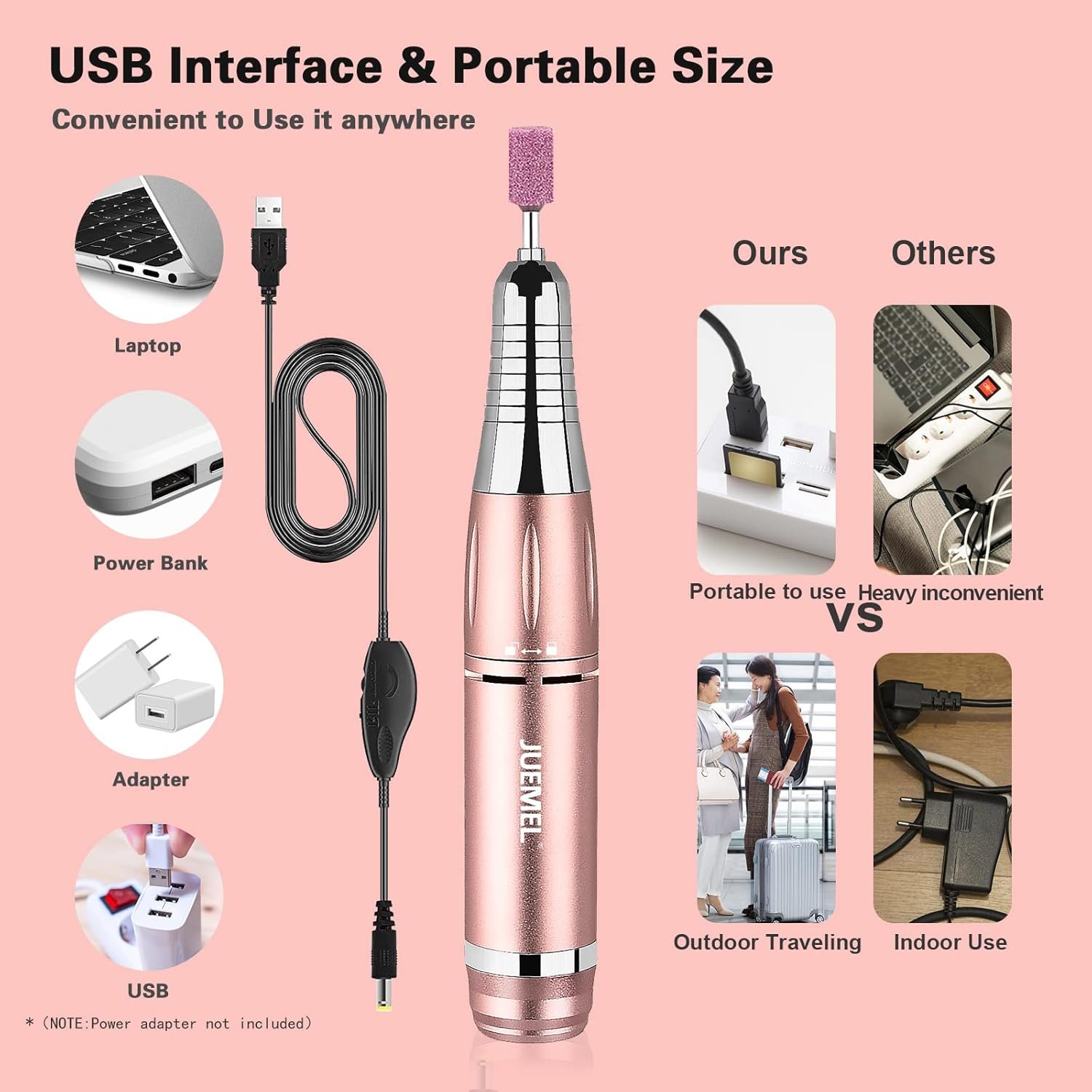 Complete Accessories & Beautiful Look: JUEMEL DRILL is equipped with 17 drill bits. Each small metal bits are 2, which is because JUEMEL understands that the small metal bits are the most easily worn part, have a high frequency of use, and are easy to lose because of their small size. Also equipped with a small brush, it easily erases dander and nail clippings. Bright pink appearance, and frosted texture, capture girls who want to be beauty.