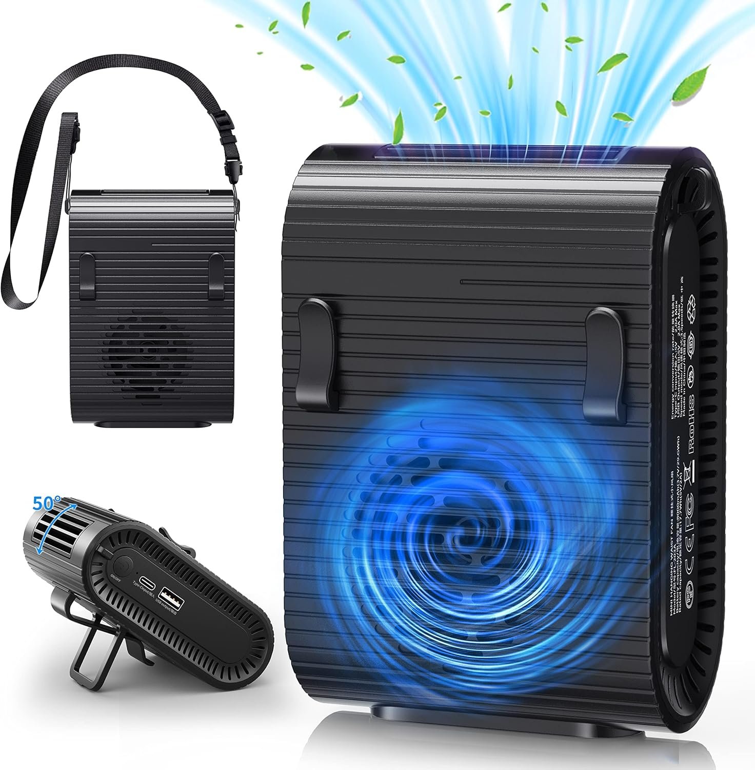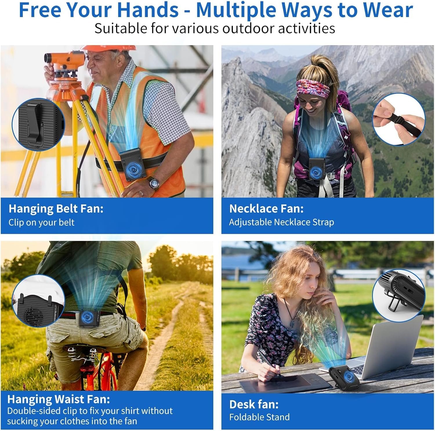 3-in-1 Portable Versatility: The Veakson Waist Fan offers versatile cooling options. Wear it around your neck, clip it to your waist, or convert it into a desktop fan effortlessly. Its adjustable air outlet supports a 50° angle, ensuring you always find the perfect position for maximum comfort, keeping you cool no matter where you are.
