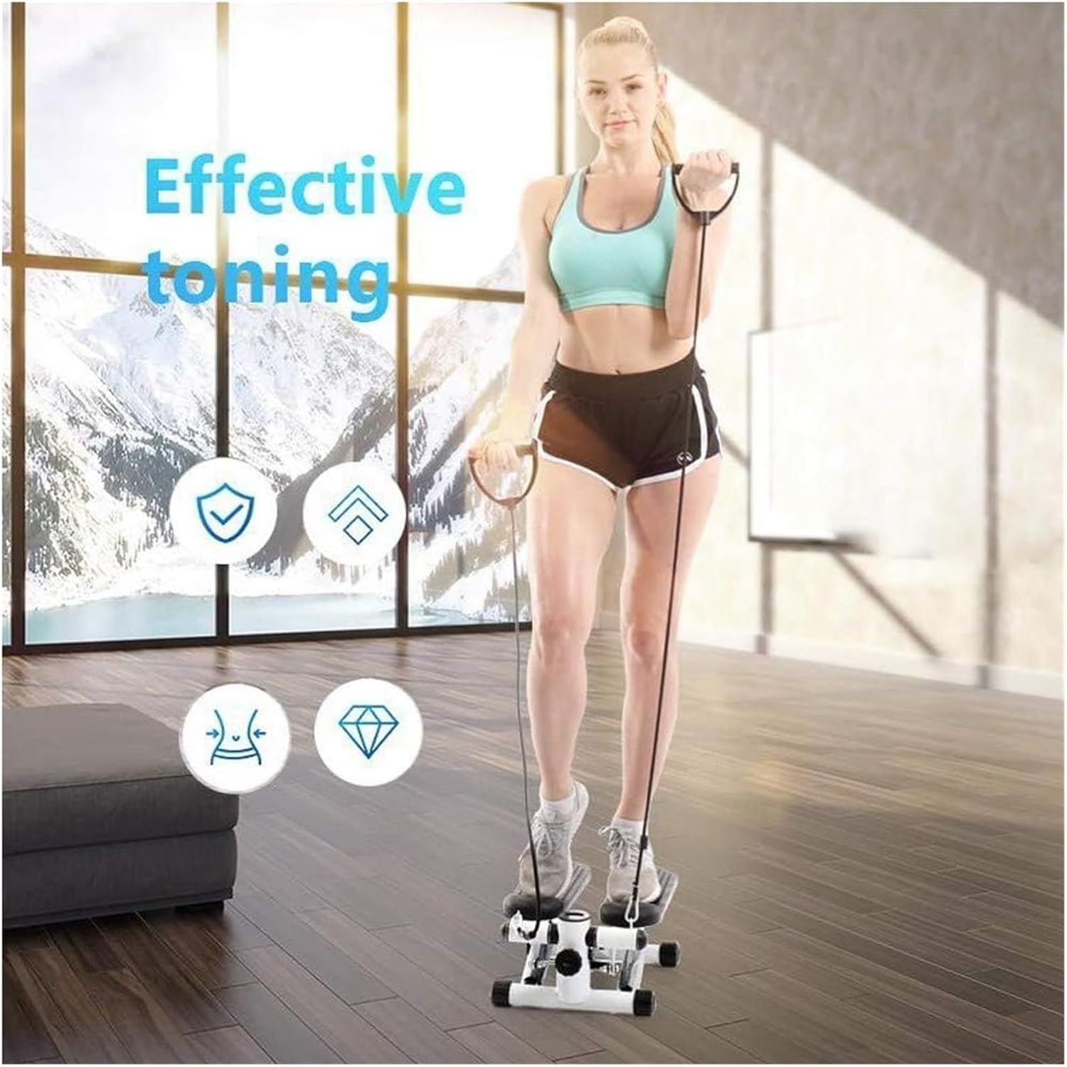 3. **Adjustable Height:** The stepper features an adjusting knob, allowing you to customize the height of the pedals to suit your preferences. Two resistance bands are also included for stretching and arm exercises.