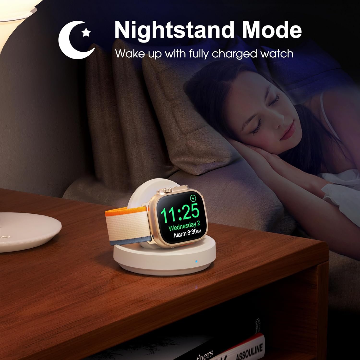 Charging with Nightstand Modes: The watch charging stand supports Apple Watch in nightstand mode, bedside time-telling piece, also could be an alarm clock. (Tips: before using the nightstand mode function, please turn on the nightstand mode in your watch settings in advance)