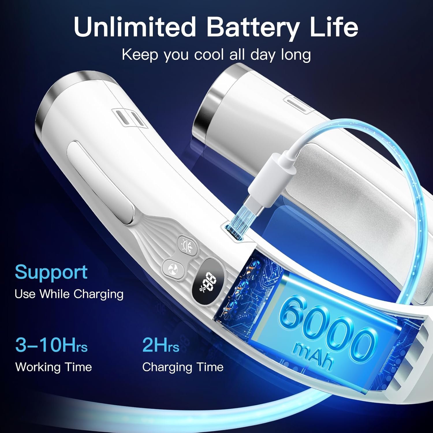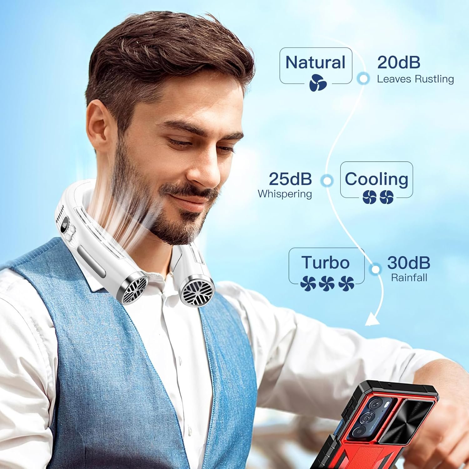 🎧[Fashionable/Technological/Comfortable]Wearable headphone design, hands-free and let you look cool.USB Rechargeable neck fan adopts the latest noise reduction technology, which is quiet and reliable, and is very suitable for outdoor work, gym, office, lawn mowing, yard work, leisure walking, driving, traveling, camping, etc.