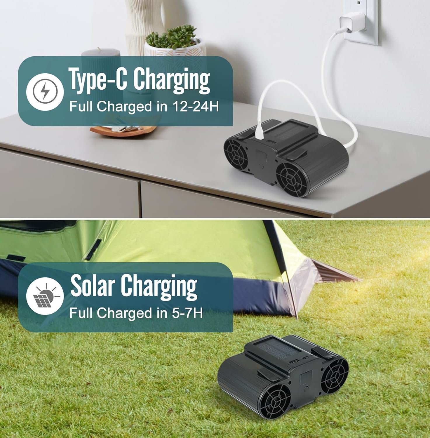 IMPRESSIVE ALL-DAY COOLING – Bid farewell to battery anxiety with our waist fan’s long-lasting cooling capabilities. Revel in up to 32 hours of continuous cooling on a single charge. With the added convenience of solar charging, you can recharge on the fly, ensuring you never miss a moment of refreshing relief. It also supports type-c fast charging through wall chargeer, laptop and other USB-enable devices. Unique charging block function, you can enjoy camping fishing while charging your phone