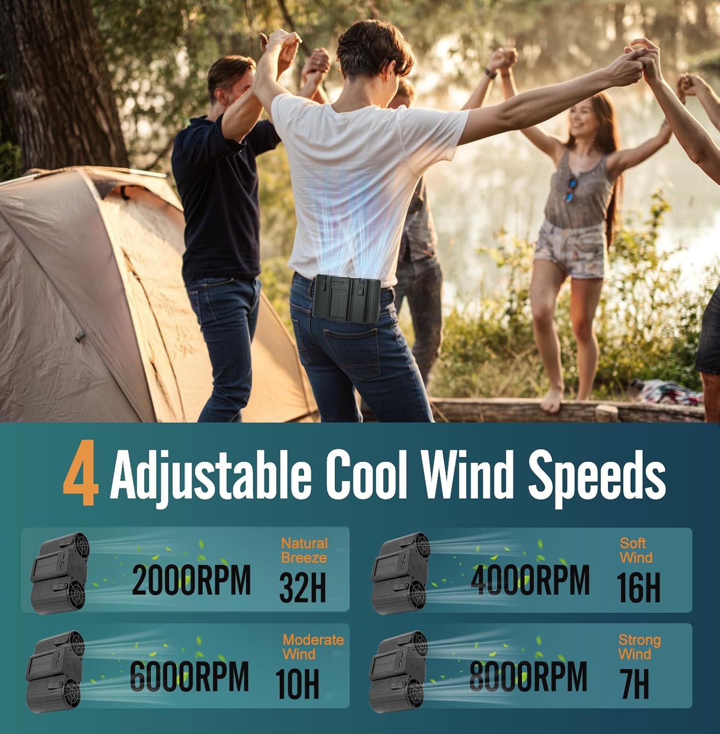 POWERFUL PERFORMANCE WITH WHISPER-QUIET OPERATION – Experience the perfect blend of power and efficiency with our waist fan’s high-performance motor and ultra-thin fan blades. Turbo fan spins up to 8000 RPM and provides 12m/s strong airflow which is powerful than similar body fan and takes away your body heat in seconds. Advanced technology avoids overheating after long time working. Enjoy a refreshing blast of airflow without disturbing your surroundings, thanks to its whisper-quiet operation