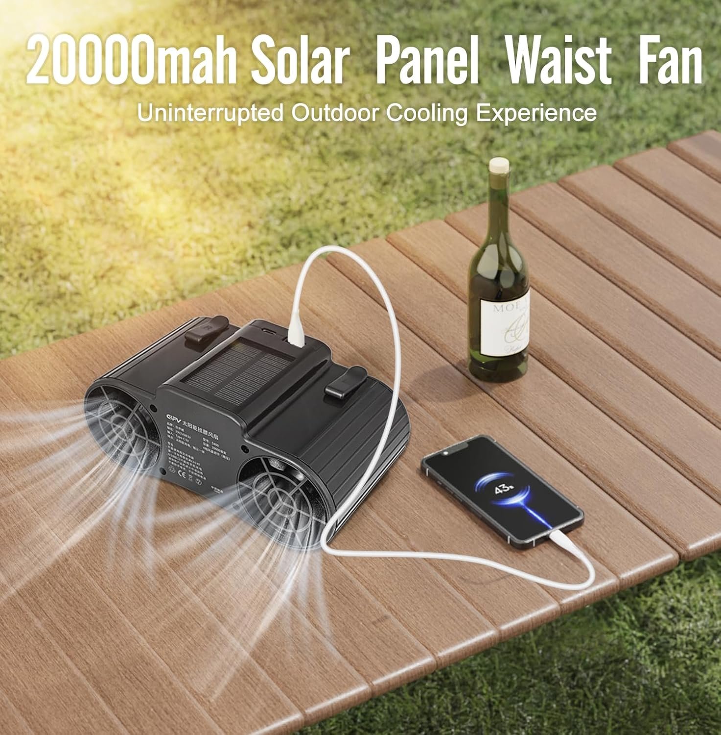 UNLEASH UNRIVALED COOLNESS WITH ENDLESS POWER – Embrace uninterrupted cooling bliss with our 20000mAh wearable waist fan. Coupled with an innovative monocrystalline silicon solar panel, perform superior compared to conventional panels with a conversion rate of up to 26%. Bask in the refreshing breeze for extended periods during outdoor adventures, camping, hiking, ensuring you stay cool and comfortable no matter where you roam.Built-in USB output to provide emergency power source for your device