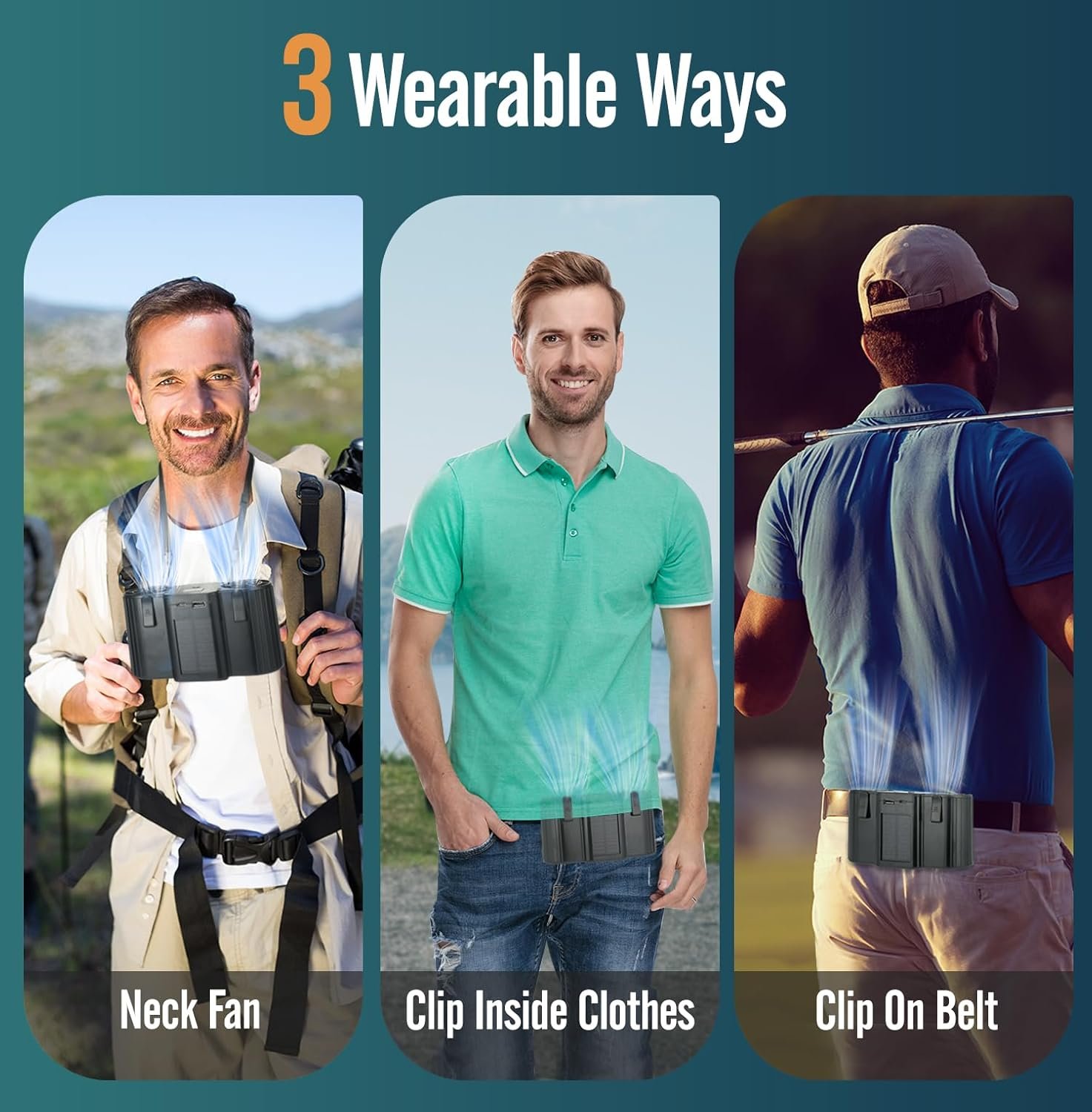 VERSATILE WEARABLE DESIGN – Specially designed with dual clips. You can easily clip it on the belt, T-shirt or pants firmly and enjoy cooling breeze from inner / outside. Equipped with an additional necklace strap, can be worn around the neck.Or simply hold it in your hand for instant relief. Perfect for outdoor work, sports, or leisure pursuits, our personal fan offers unparalleled flexibility and convenience wherever you go. Say goodbye to sweaty discomfort with our multifunctional shirt fan
