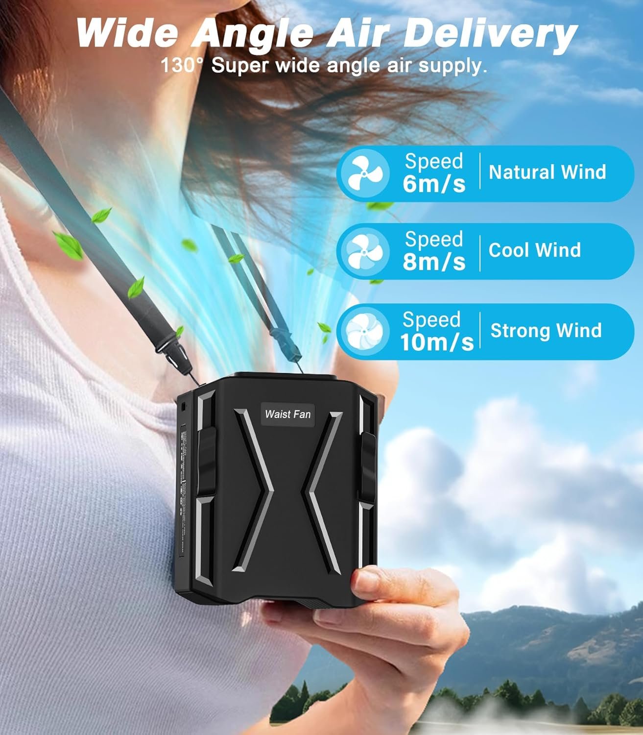 WIDE ANGLE AIR DELIVERY: With 130° range, this portable waist fan shirt fan provides wide-angle air delivery covering your entire body. Choose from 3 wind speeds and enjoy fast blowing speed with 14,168 revolutions per minute and 10m second air delivery distance