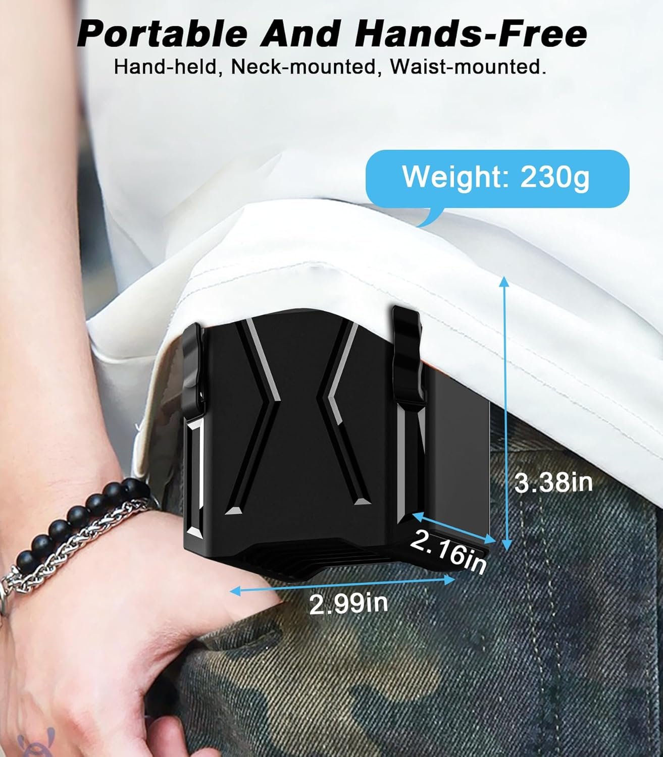 PORTABLE & HANDS-FREE: Our portable waist clip fan is lightweight and compact, similar in size wide to an Iphone, weighs 230 grams, only 50 grams heavier than the Iphone 15. It can be handheld, clipped to your pants, belt, or around your neck with a lanyard, providing hassle-free cooling on the go