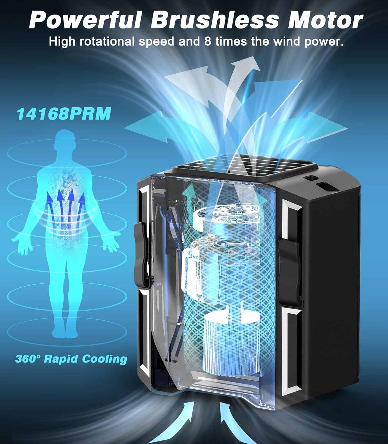 POWERFUL BRUSHLESS MOTOR: Equipped with a high-speed brushless motor and 5 blades, our waist fan clip on provides powerful wind while running quietly and smoothly. Ideal for people who work in hot environments or enjoy the outdoors
